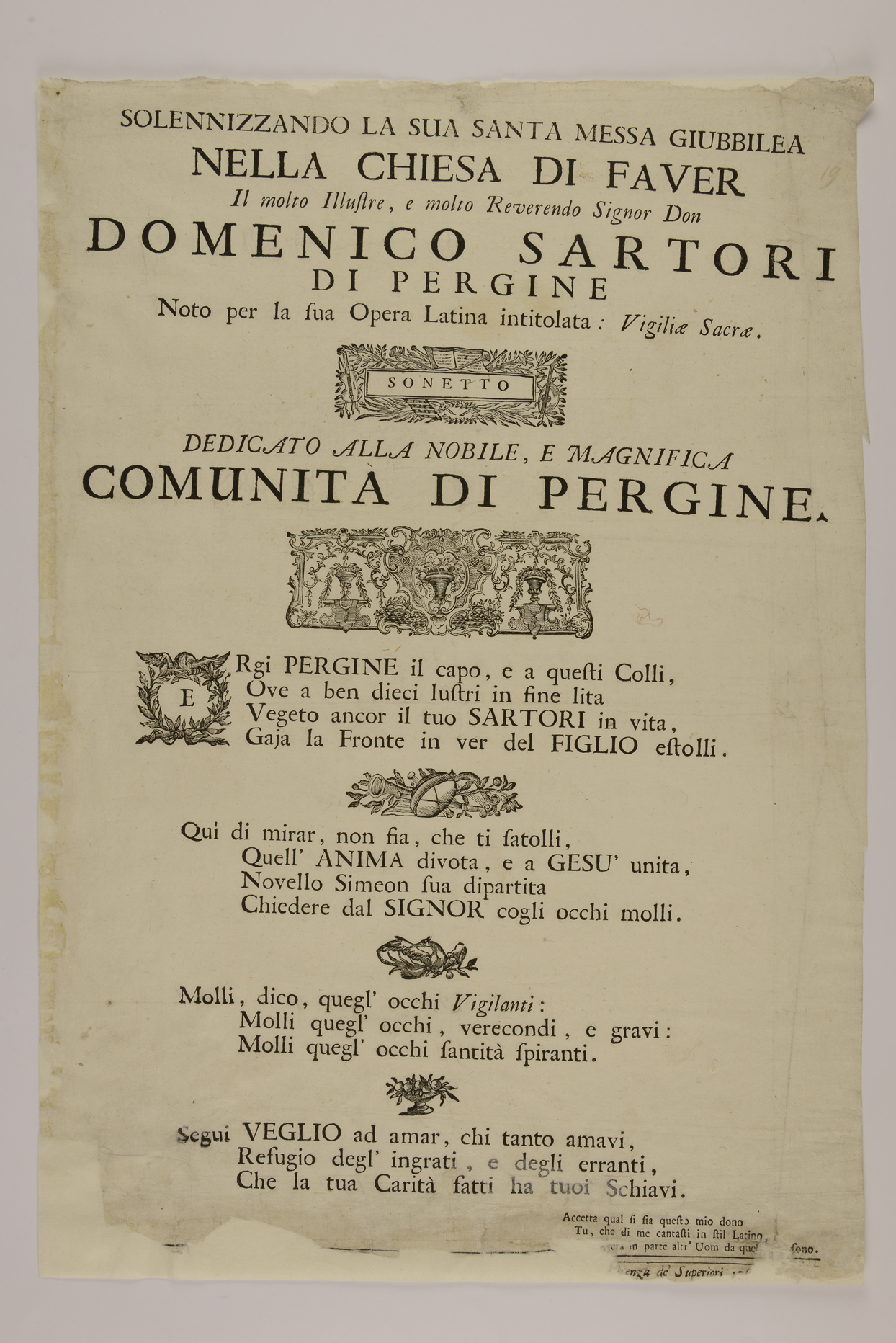 | Solennizzando la sua santa messa giubbilea nella chiesa di Faver il molto illustre, e molto reverendo signor don Domenico Sartori di Pergine noto per la sua opera latina intitolata Vigiliae sacrae. Sonetto dedicata alla comunità di Pergine |