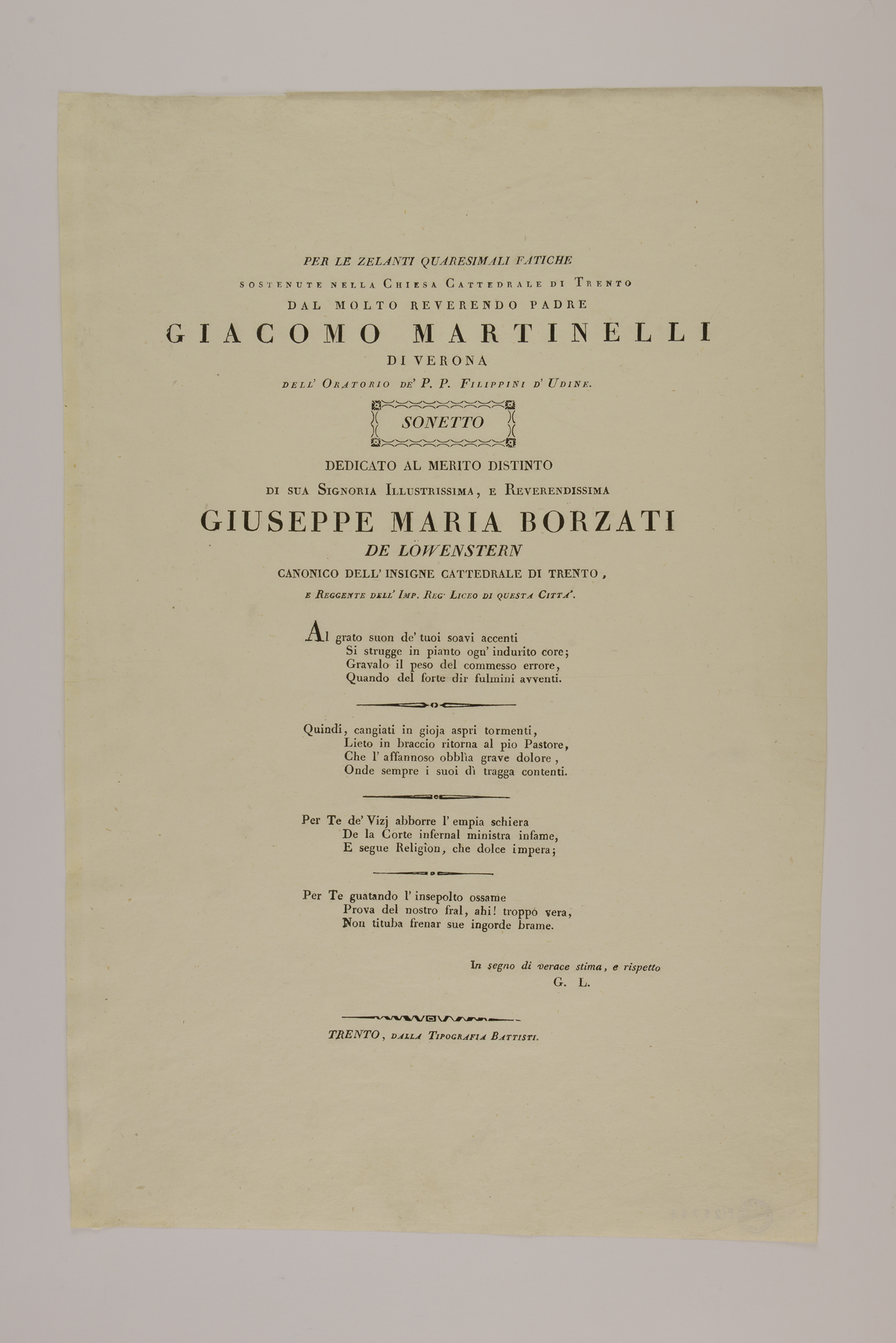 | Per le zelanti quaresimali fatiche sostenute nella chiesa cattedrale di Trento dal molto reverendo padre Giacomo Martinelli di Verona ... sonetto ... |