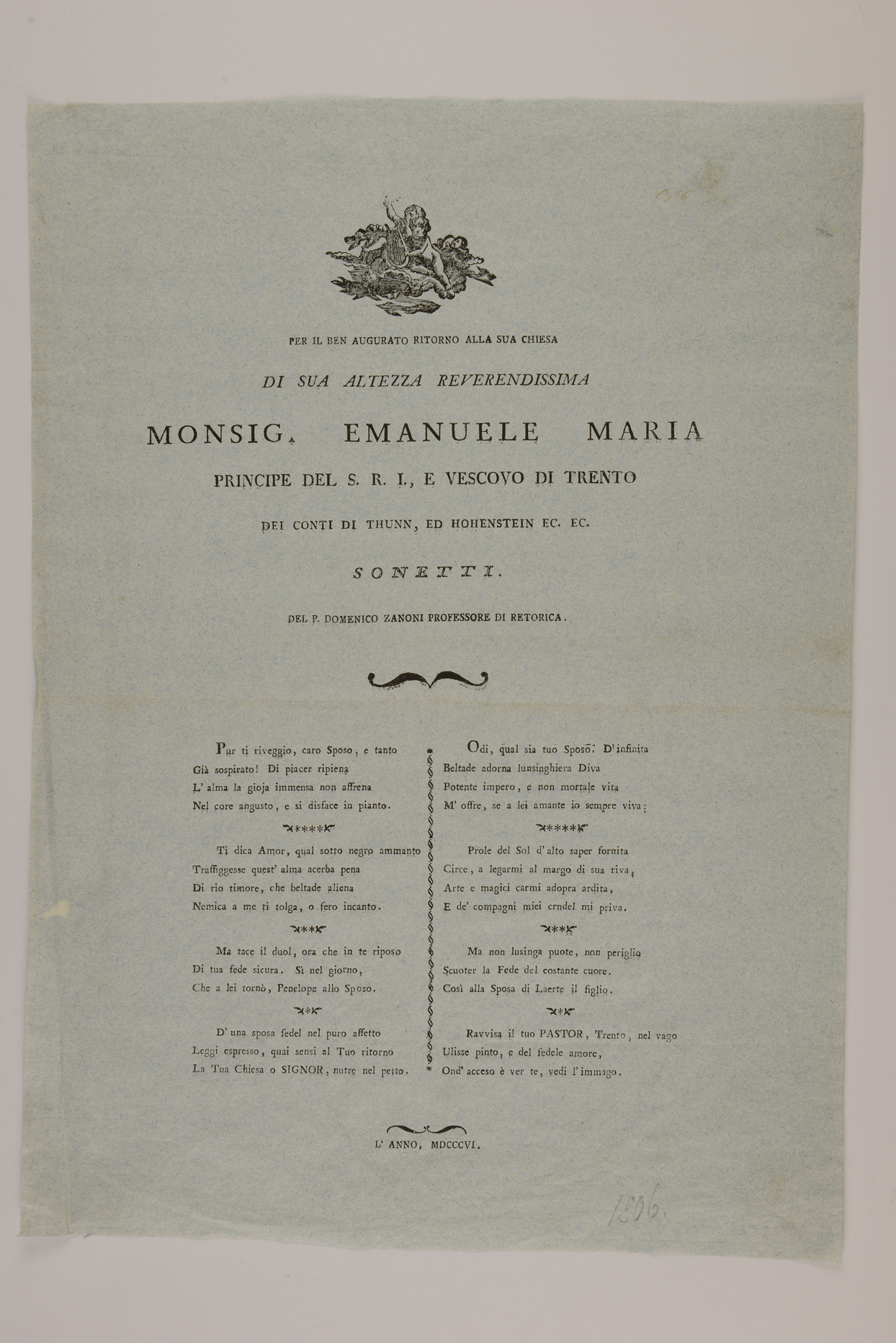 | Per il ben augurato ritorno alla sua chiesa di sua altezza reverendissima monsig. Emanuele Maria principe del S.R.I. e vescovo di Trento dei conti di Thunn ed Hohenstein ec. ec. Sonetti del P. Domenico Zanoni professore di retorica |
