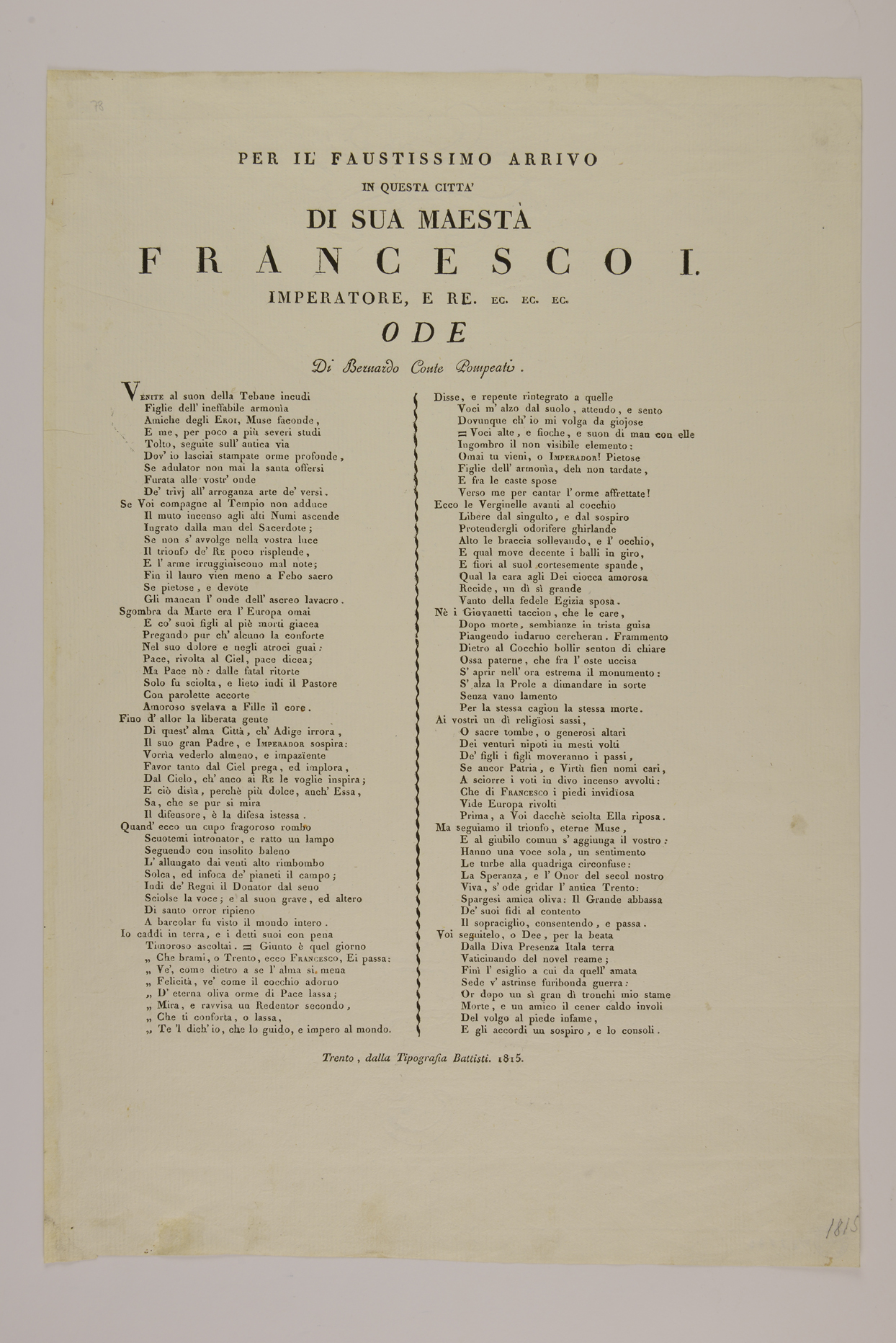 | Per il faustissimo arrivo in questa città di sua maestà Francesco I imperatore e re ec. ec. ec. Ode di Bernardo conte Pompeati |