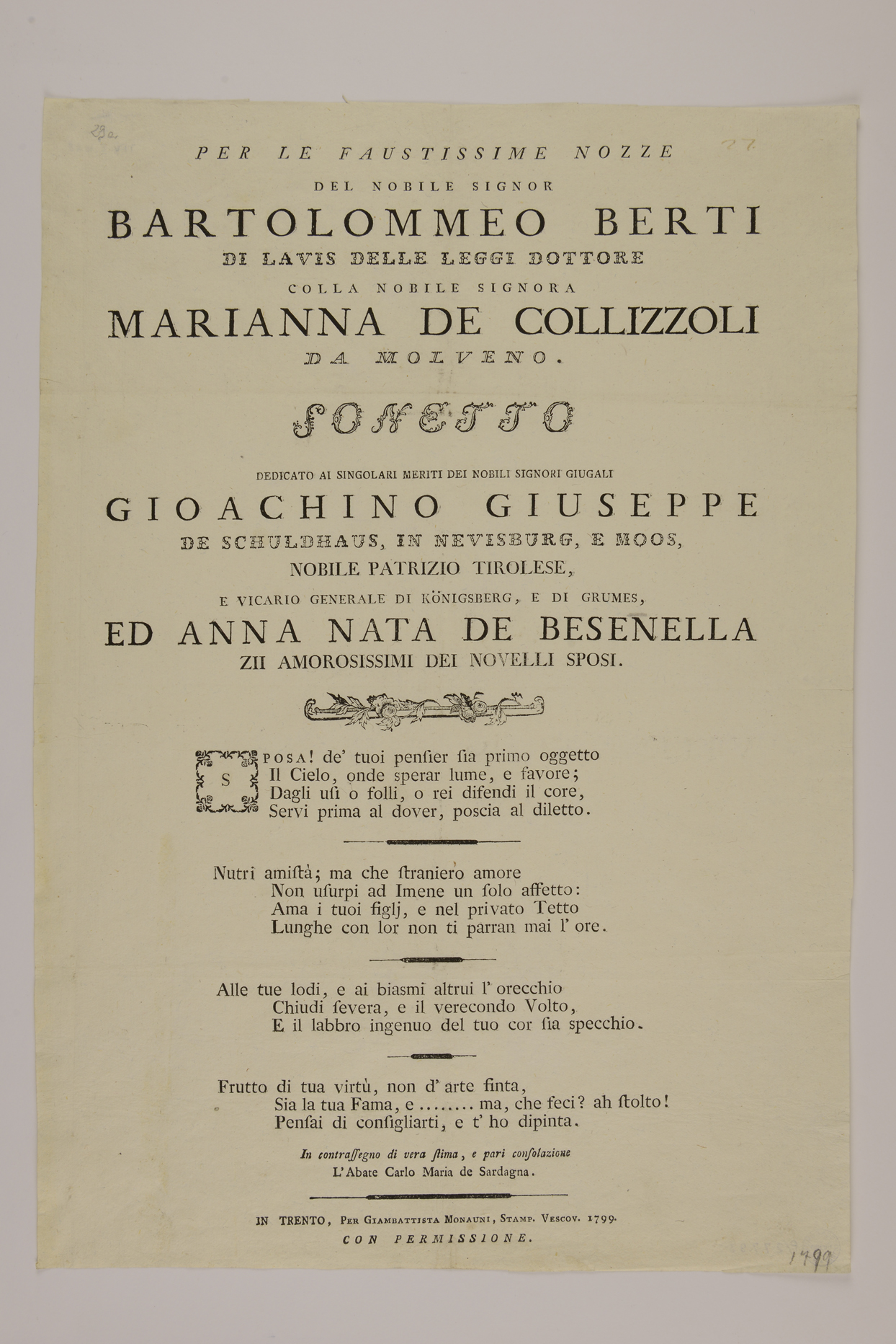 | Per le faustissime nozze del nobile signor Bartolommeo Berti di Lavis delle leggi dottore colla nobile signora Marianna de Collizzolli da Molveno. Sonetto dedicato ai singolari meriti dei nobili signori giugali Gioachino Giuseppe de Schuldhaus, in Nevisburg, e Moos, nobile patrizio tirolese, e vicario generale di Königsberg, e di Grumes, ed Anna nata de Besenella, zii amorosissimi dei novelli sposi |