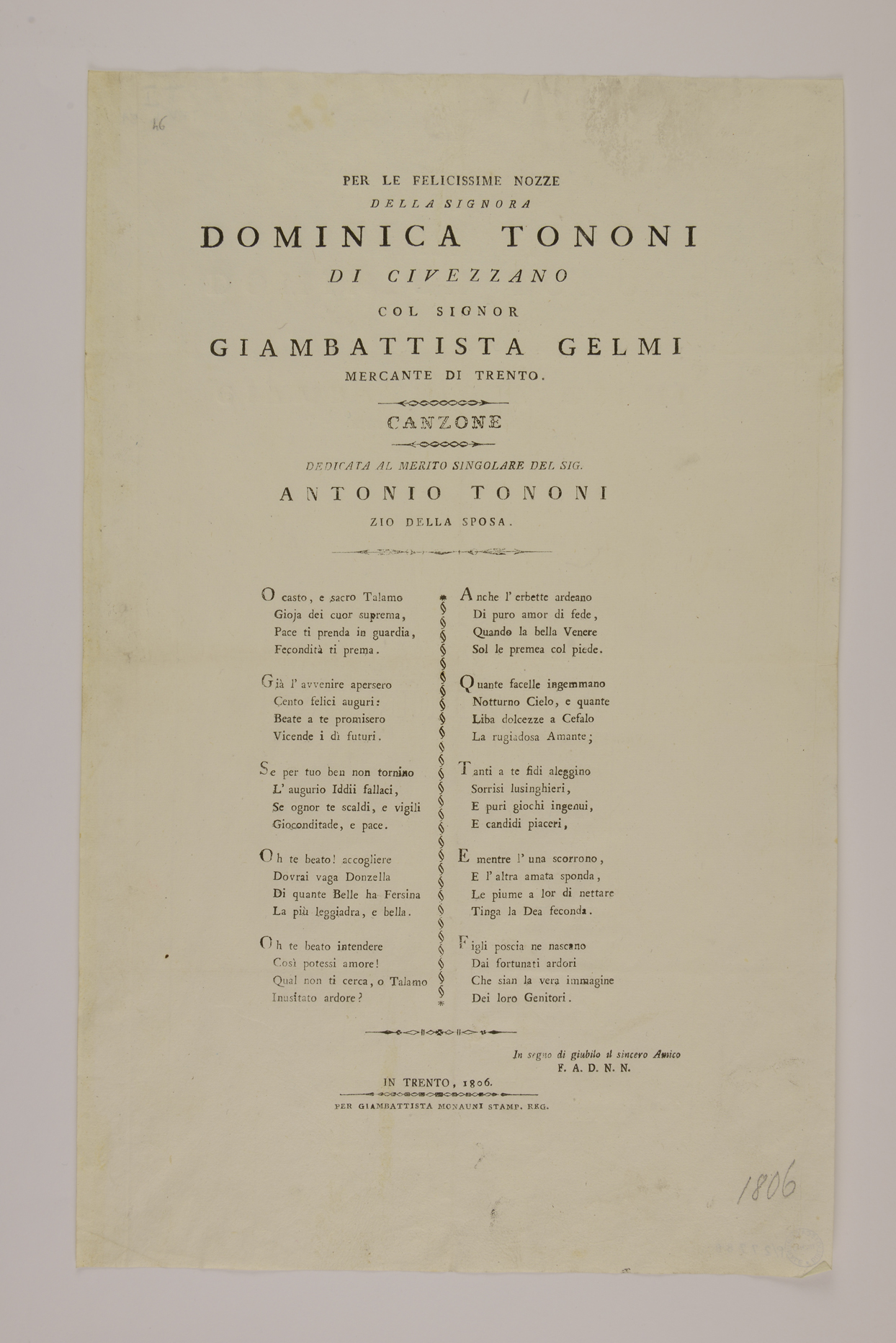 | Per le felicissime nozze della signora Dominica Tononi di Civezzano col signor Giambattista Gelmi mercante di Trento. Canzone dedicata al merito singolare del sig. Antonio Tononi zio della sposa |