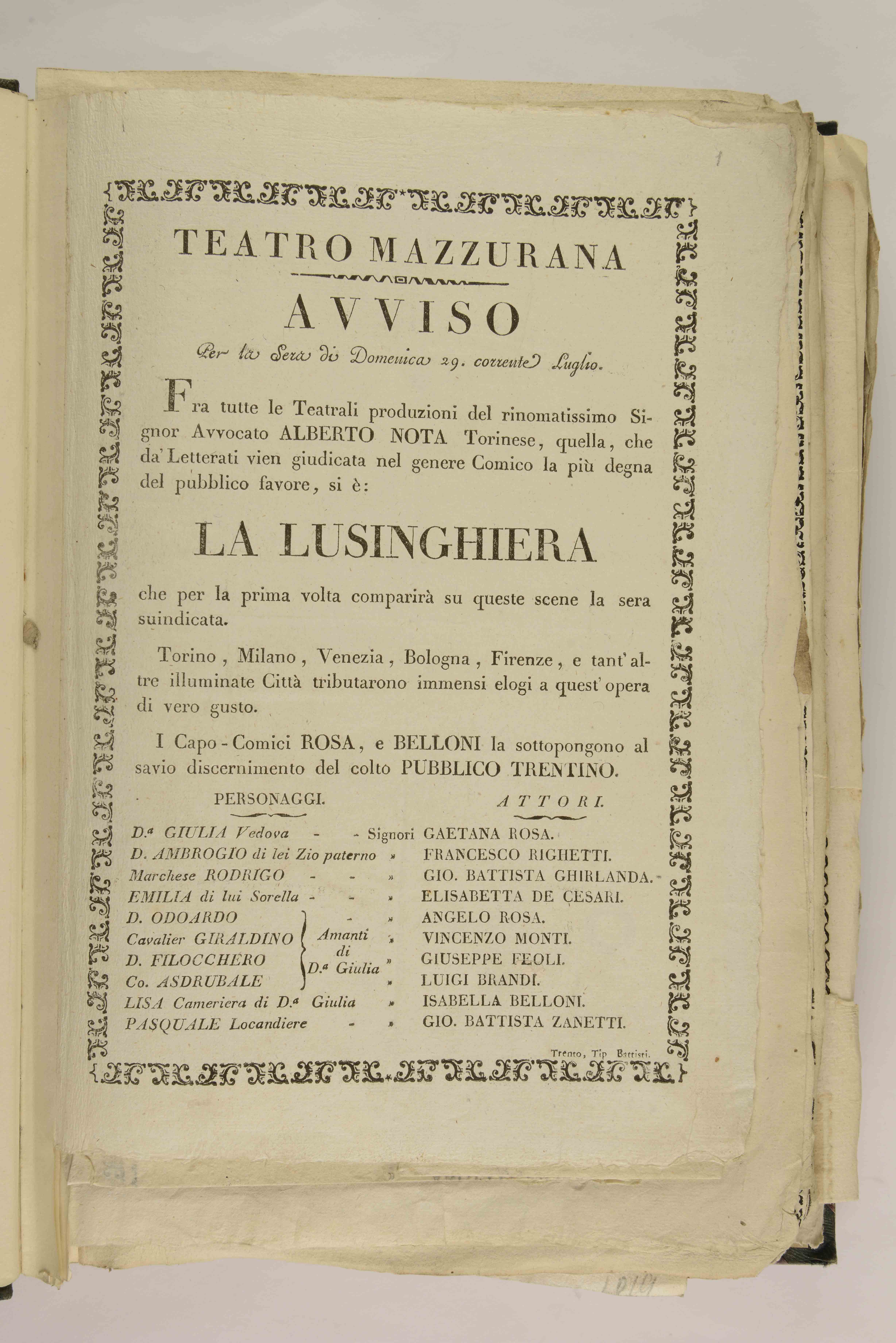 | Teatro Mazzurana. Avviso per la sera di domenica 29. corrente luglio |