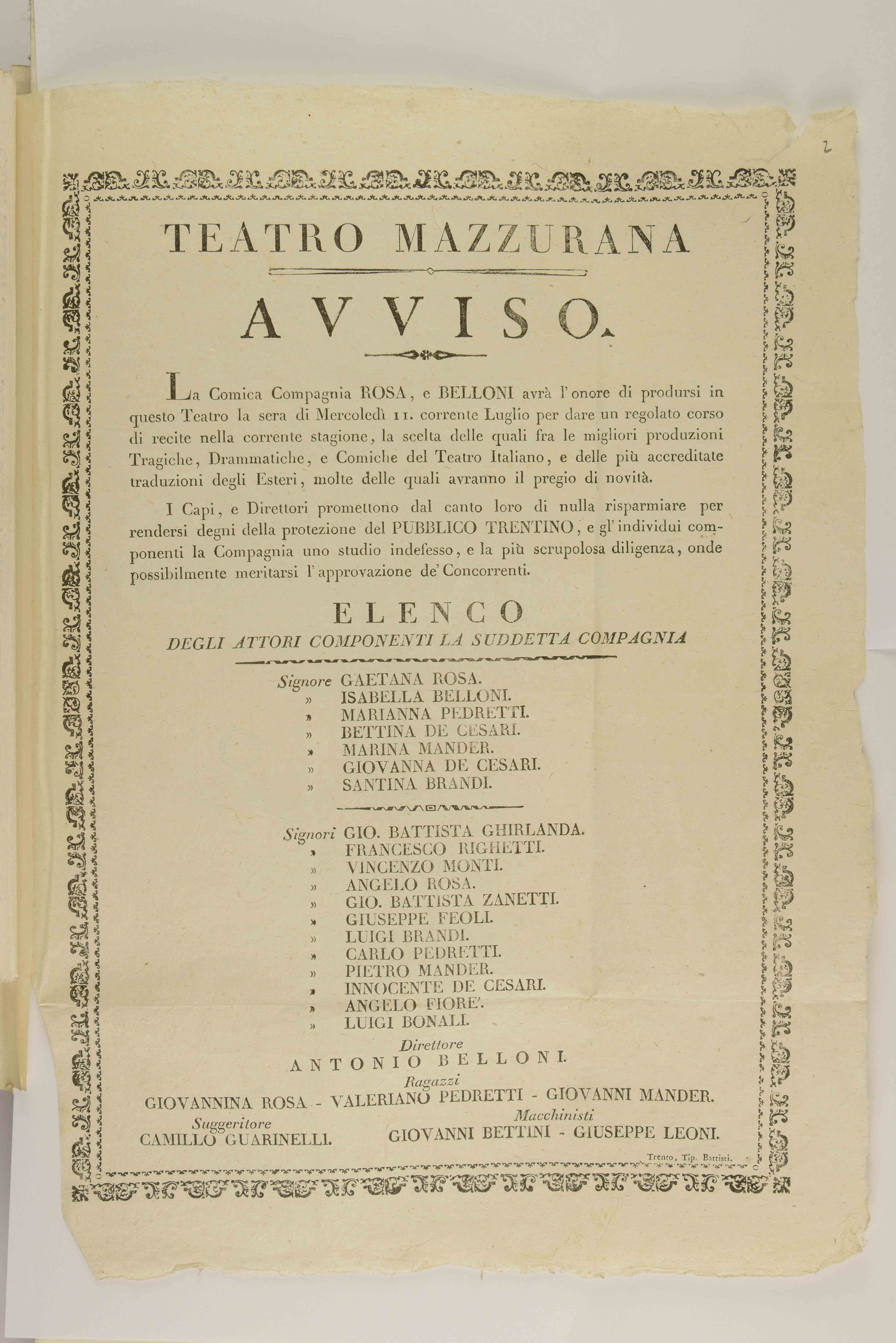 La comica compagnia Rosa, e Belloni avrà l'onore di prodursi in questo teatro ...