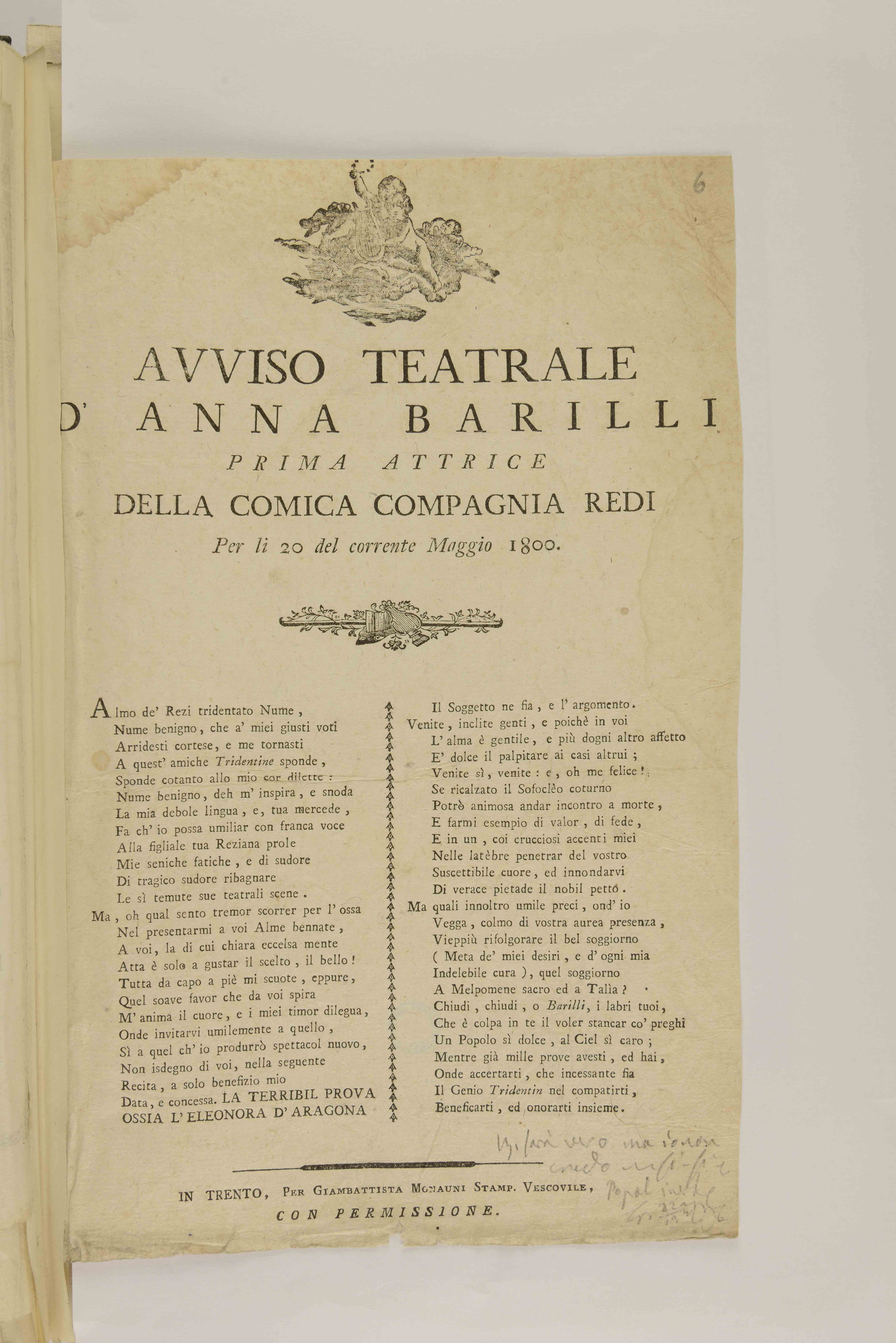 | Avviso teatrale d'Anna Barilli prima attrice della comica compagnia Redi per li 20 del corrente maggio 1800 |