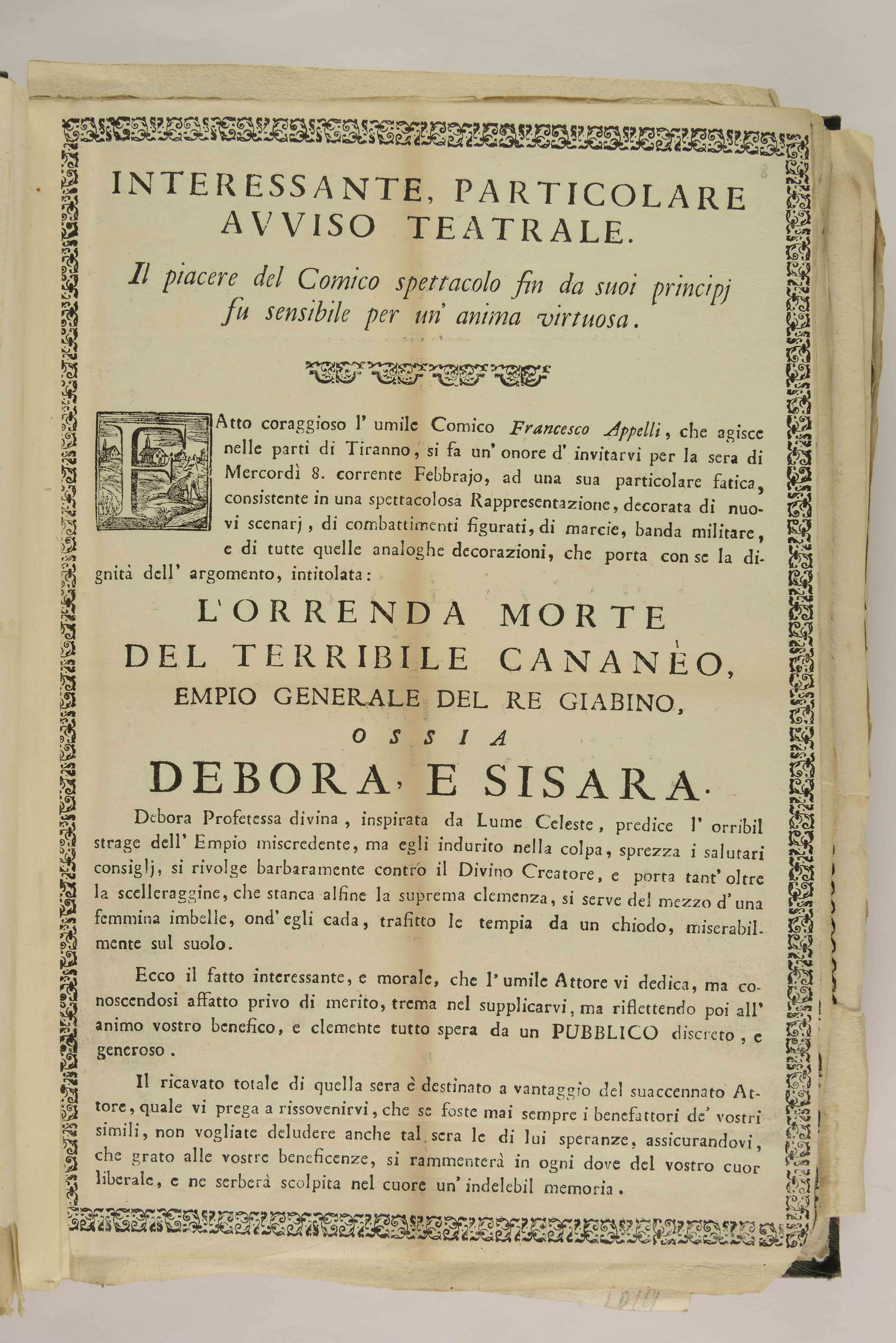 | Interessante, particolare avviso teatrale. Il piacere del comico spettacolo fin da suoi principj fu sensibile per un'anima virtuosa |