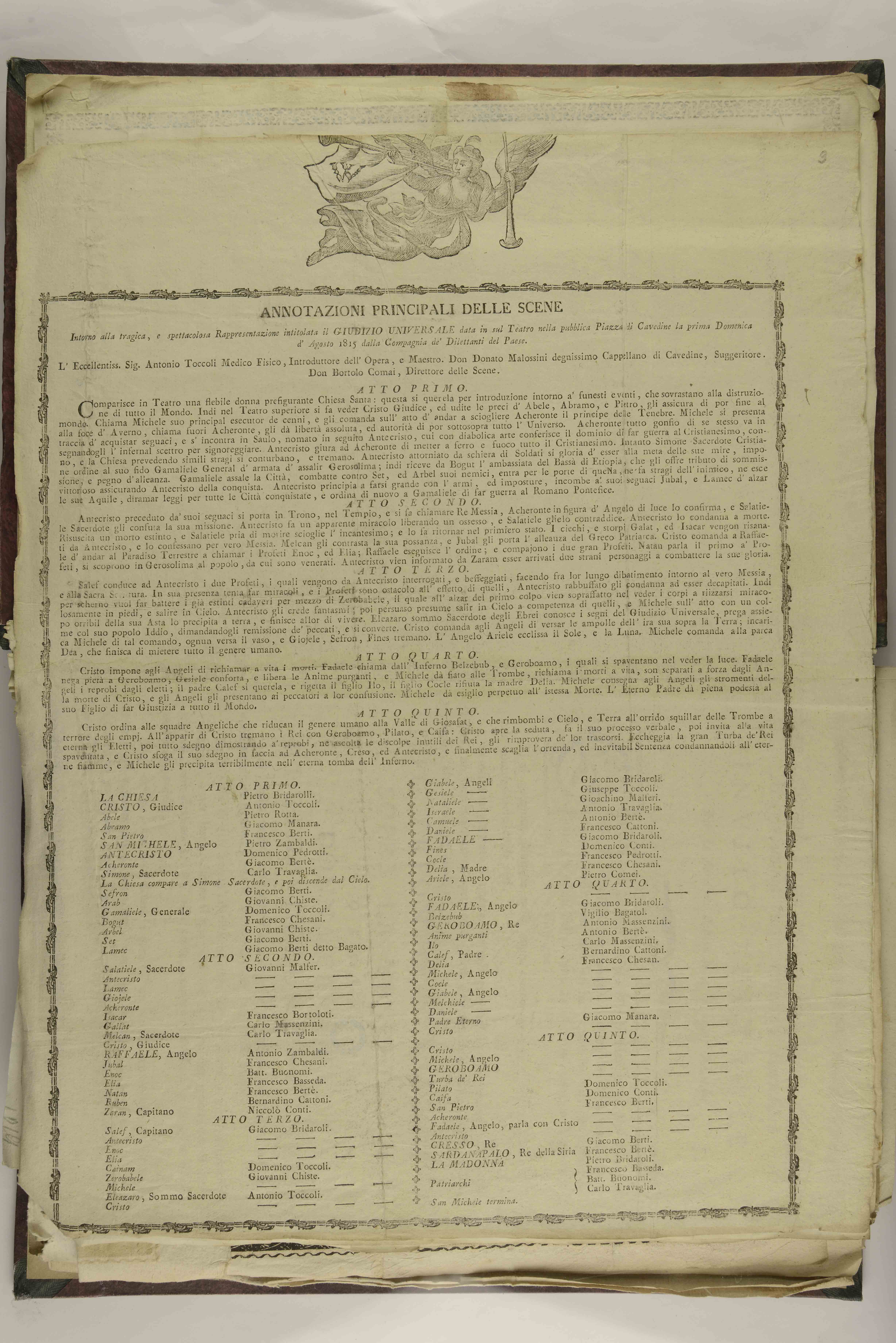 | Annotazioni principali delle scene intorno alla tragica, e spettacolosa rappresentazione intitolata il Giudizio universale data in sul teatro nella pubblica piazza di Cavedine la prima domenica d'agosto 1815 dalla Compagnia de' dilettanti del paese |