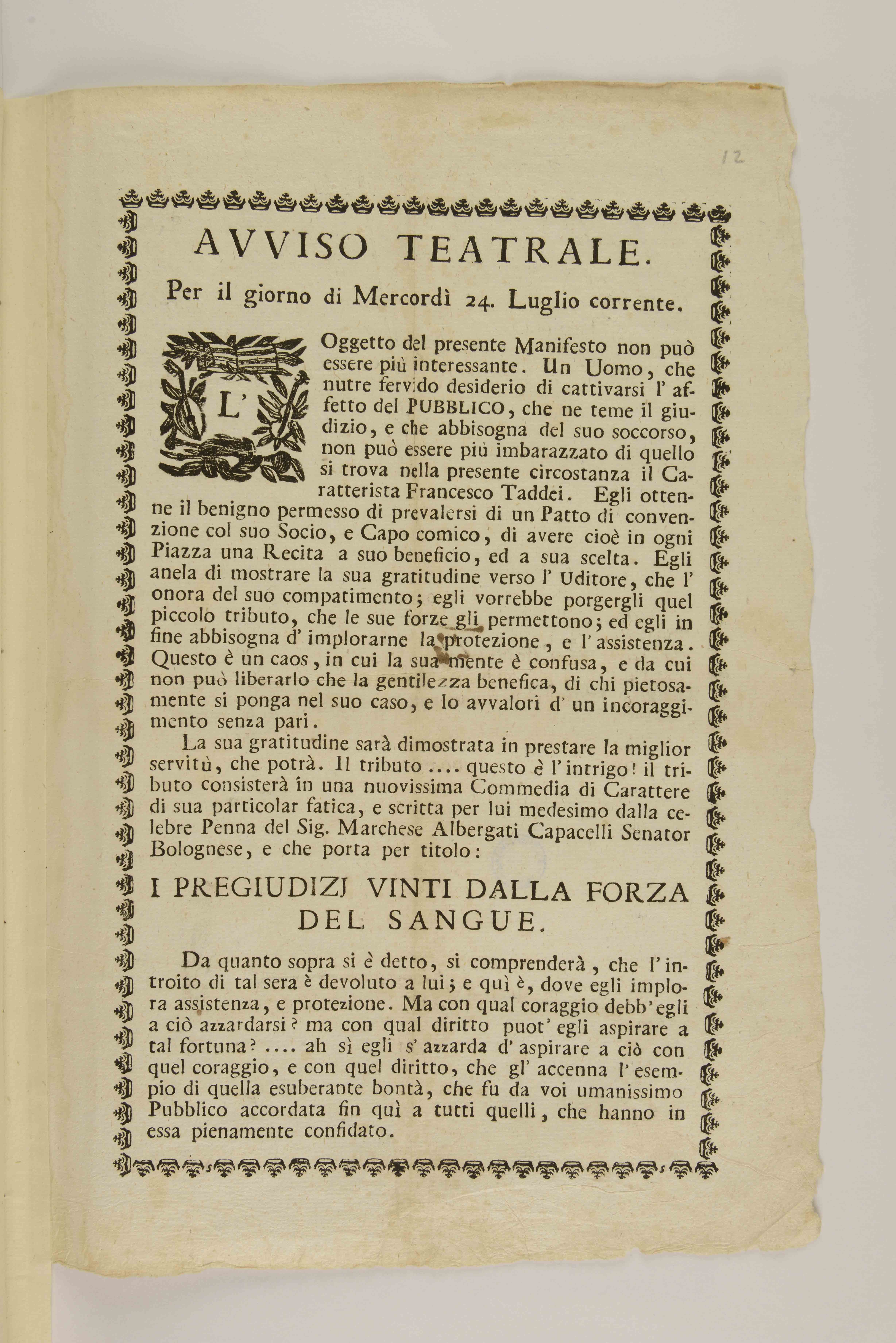 Avviso teatrale. Per il giorno di mercordì 24. luglio corrente