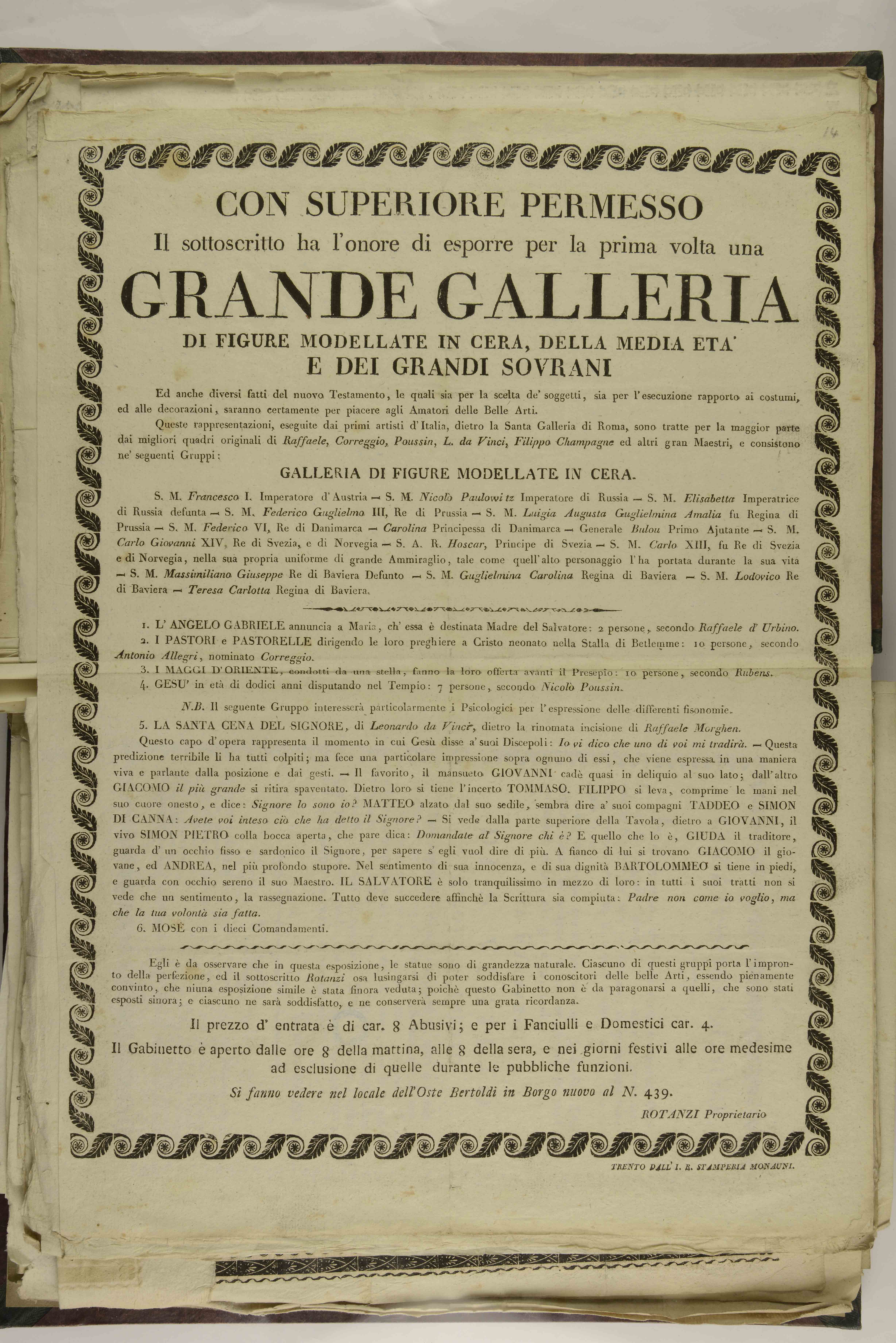 | Con superiore permesso il sottoscritto ha l'onore di esporre per la prima volta una grande galleria di figure modellate in cera, della media età e dei grandi sovrani |