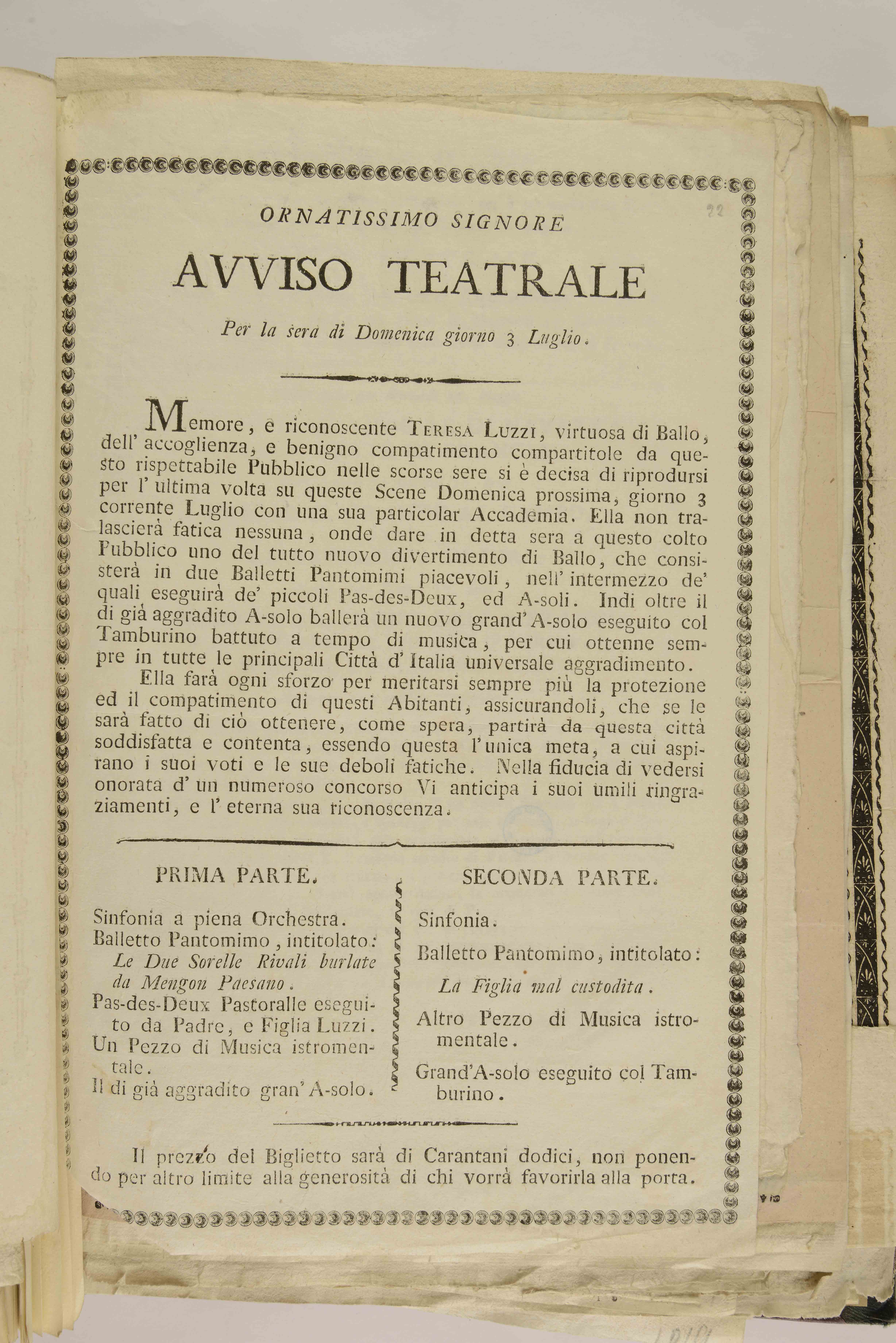 Ornatissimo signore. Avviso teatrale per la sera di domenica giorno 3 luglio