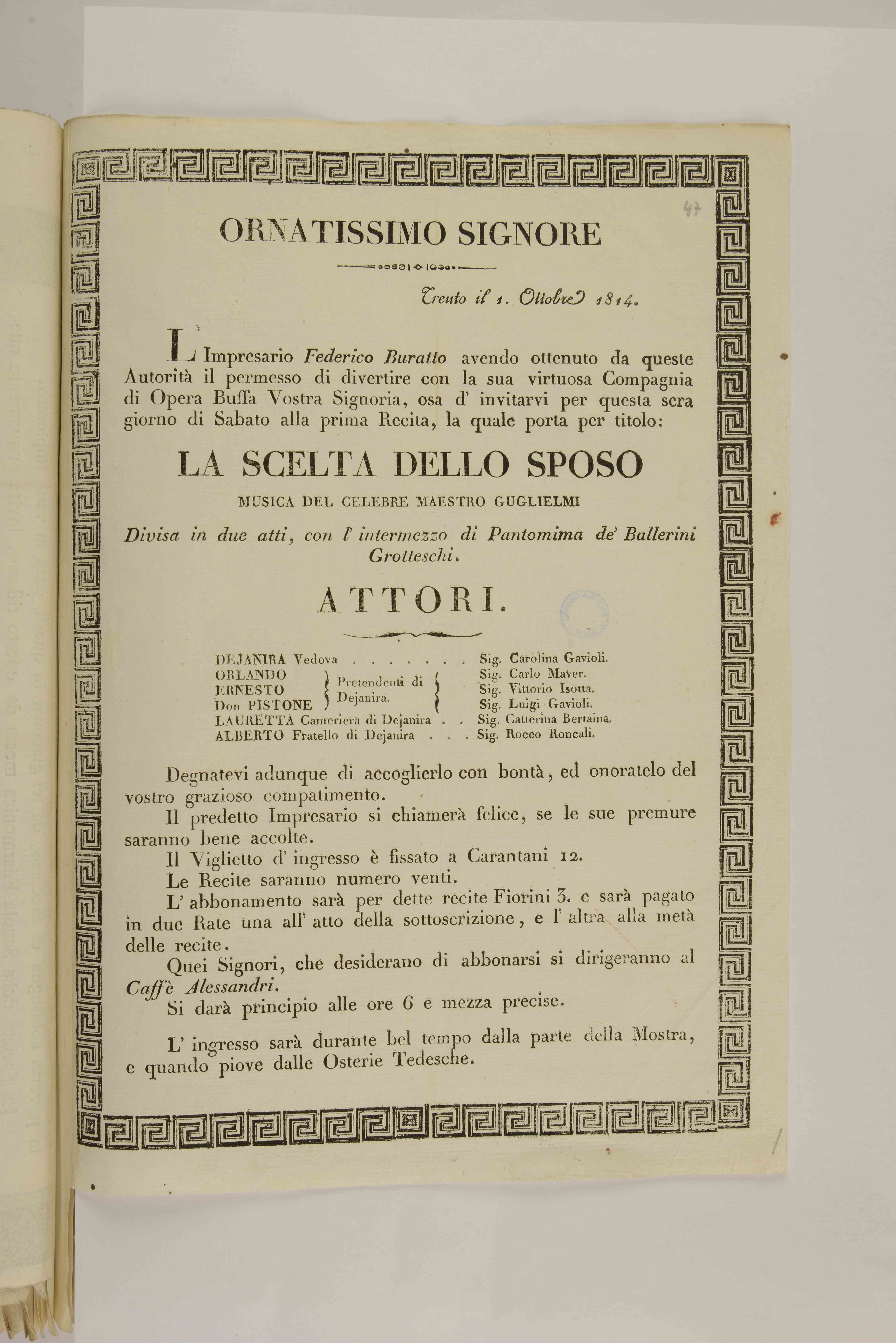 | Ornatissimo signore. Trento il 1. ottobre 1814 |