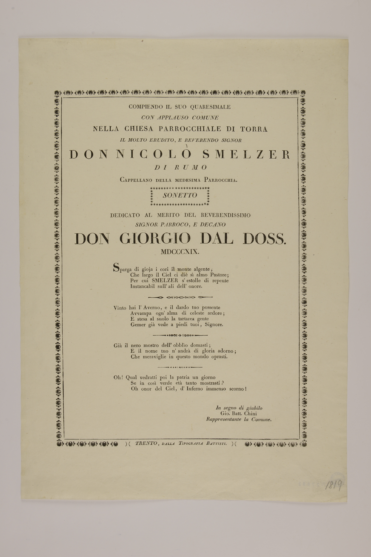 | Compiendo il suo quaresimale con applauso comune nella chiesa parrocchiale di Torra il molto erudito e reverendo signor don Nicolò Smelzer di Rumo cappellano della medesima parrocchia. Sonetto dedicato al merito del reverendissimo signor parroco, e decano don Giorgio Dal Doss. MDCCCXIX |