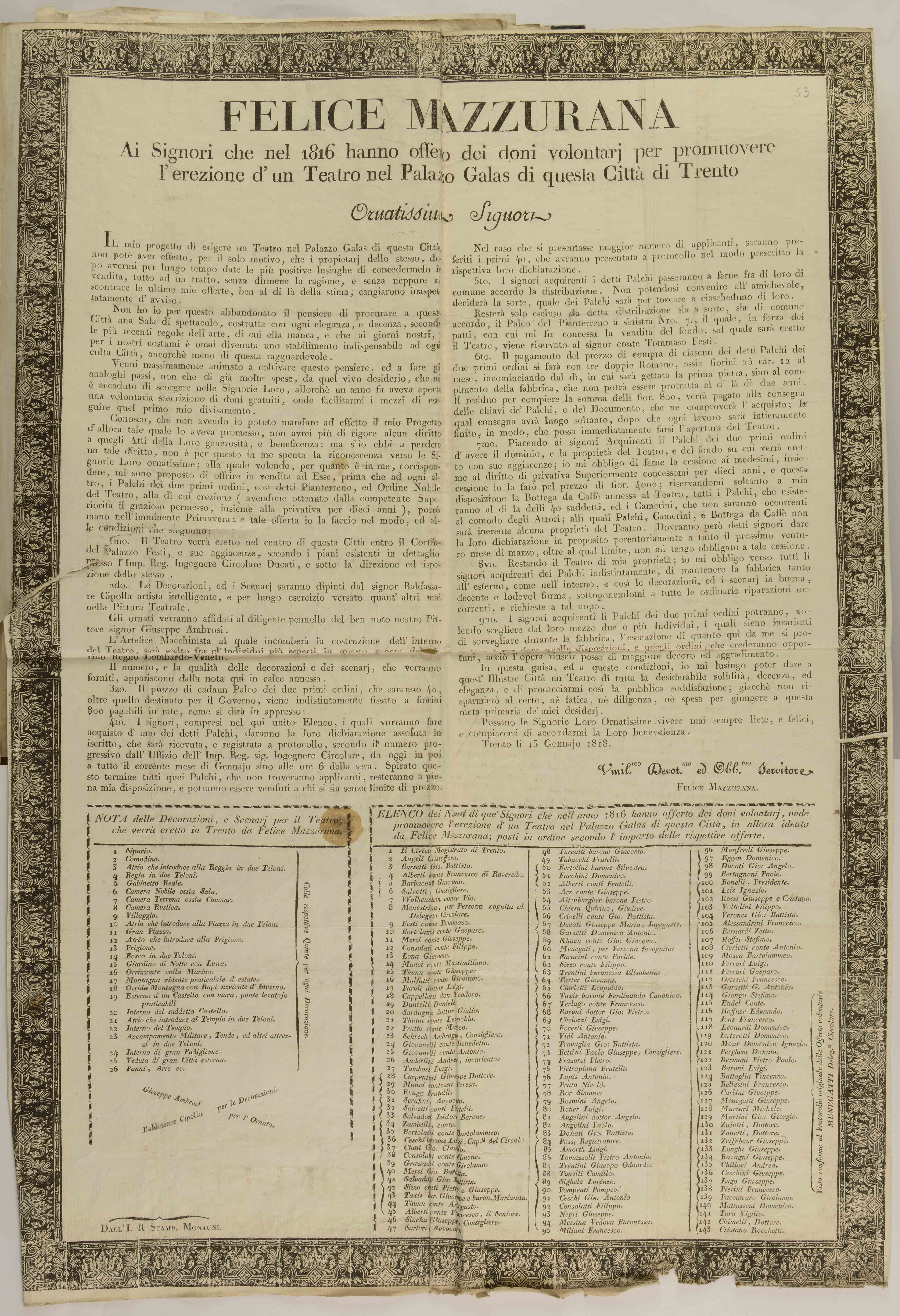 | Felice Mazzurana ai signori che nel 1816 hanno offerto dei doni volontarj per promuovere l'erezione d'un teatro nel palazzo Galas di questa città di Trento, ornatissimi signori |