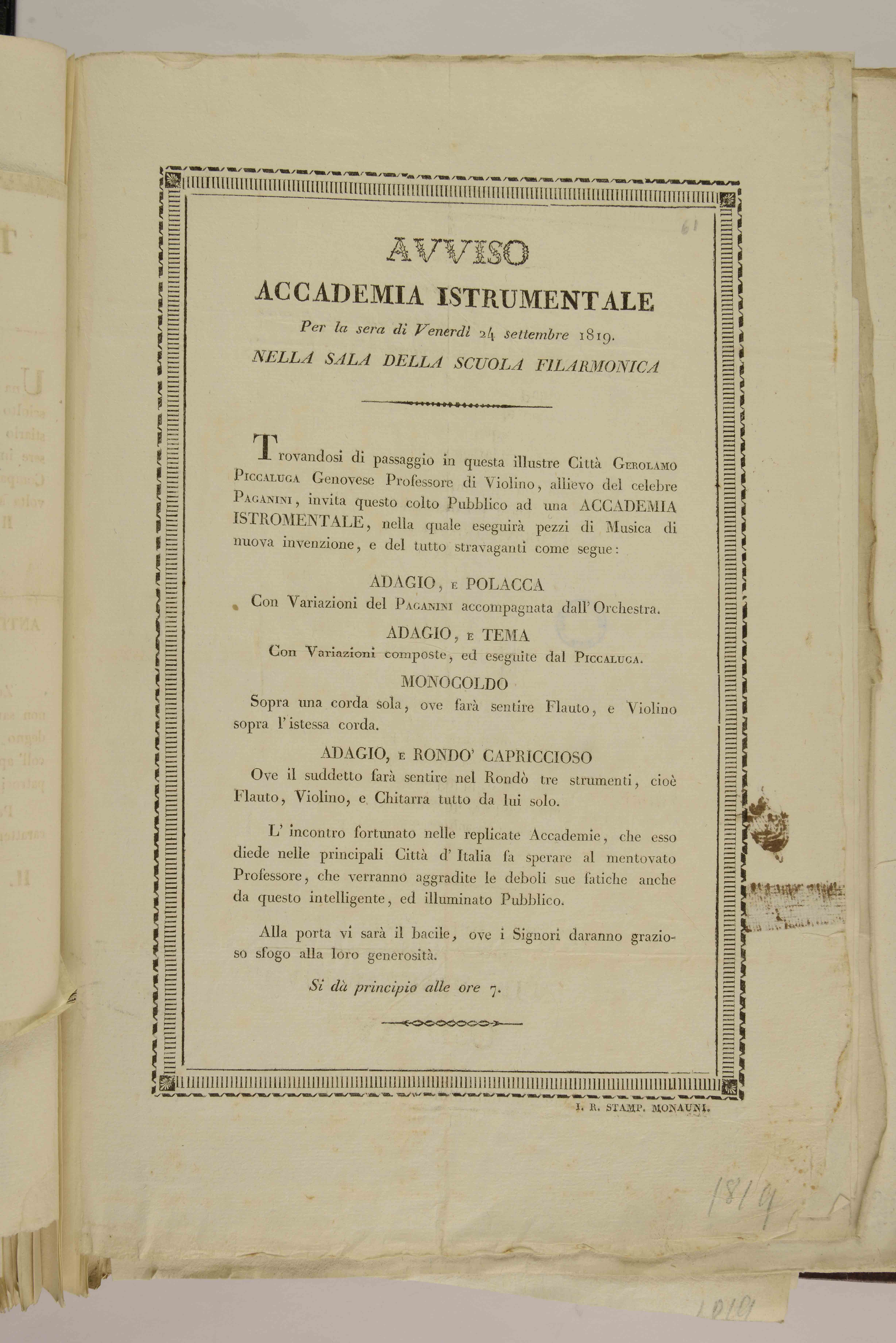 Avviso, accademia istrumentale per la sera di venerdì 24 settembre 1819....