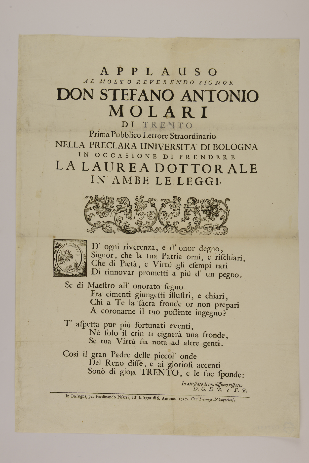 | Applauso al molto reverendo signor don Stefano Antonio Molari di Trento prima pubblico lettore straordinario nella preclara Università di Bologna in occasione di prendere la laurea dottorale in ambe le leggi |