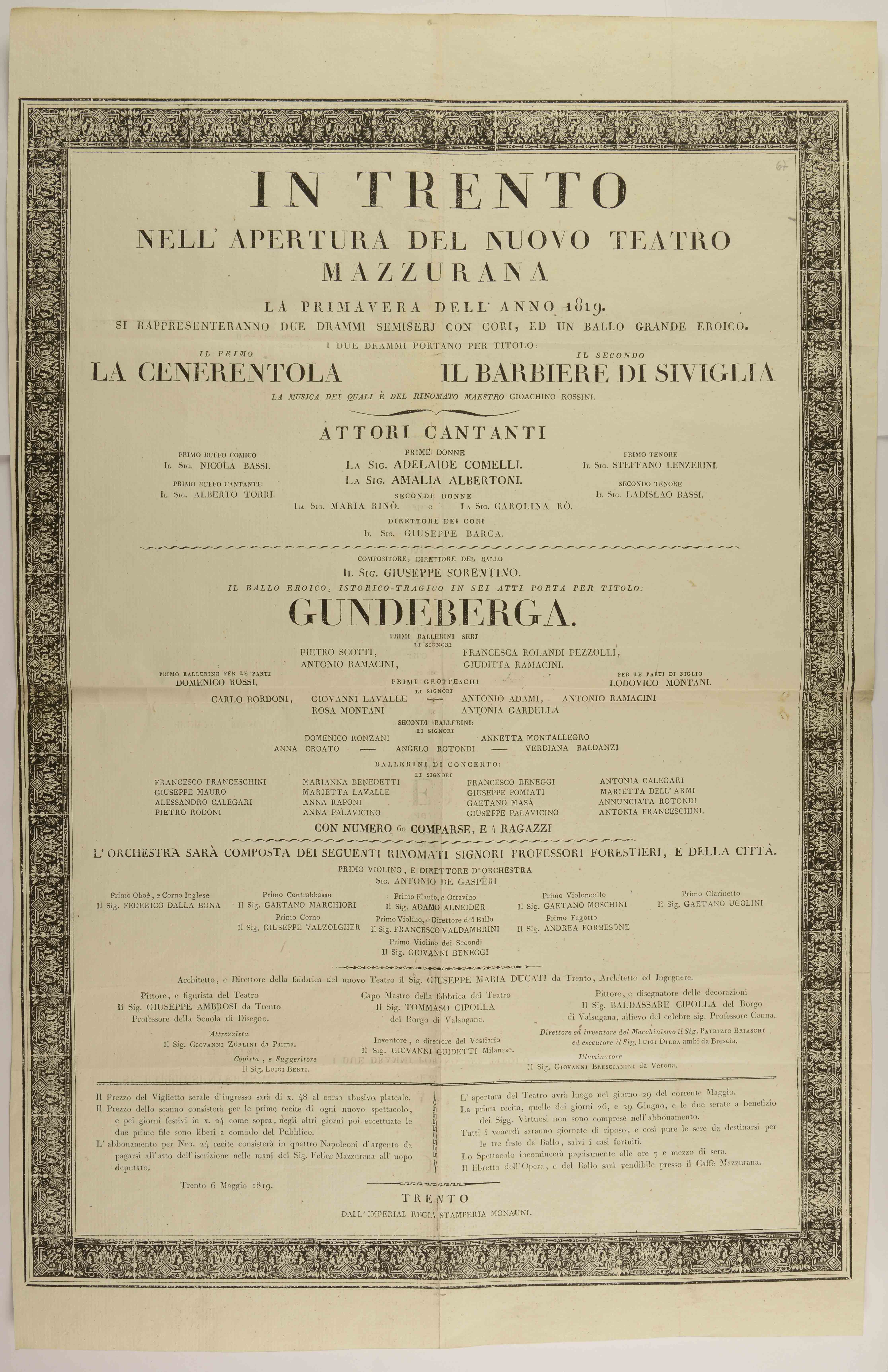 In Trento nell'apertura del nuovo teatro Mazzurana la primavera dell'anno 1819