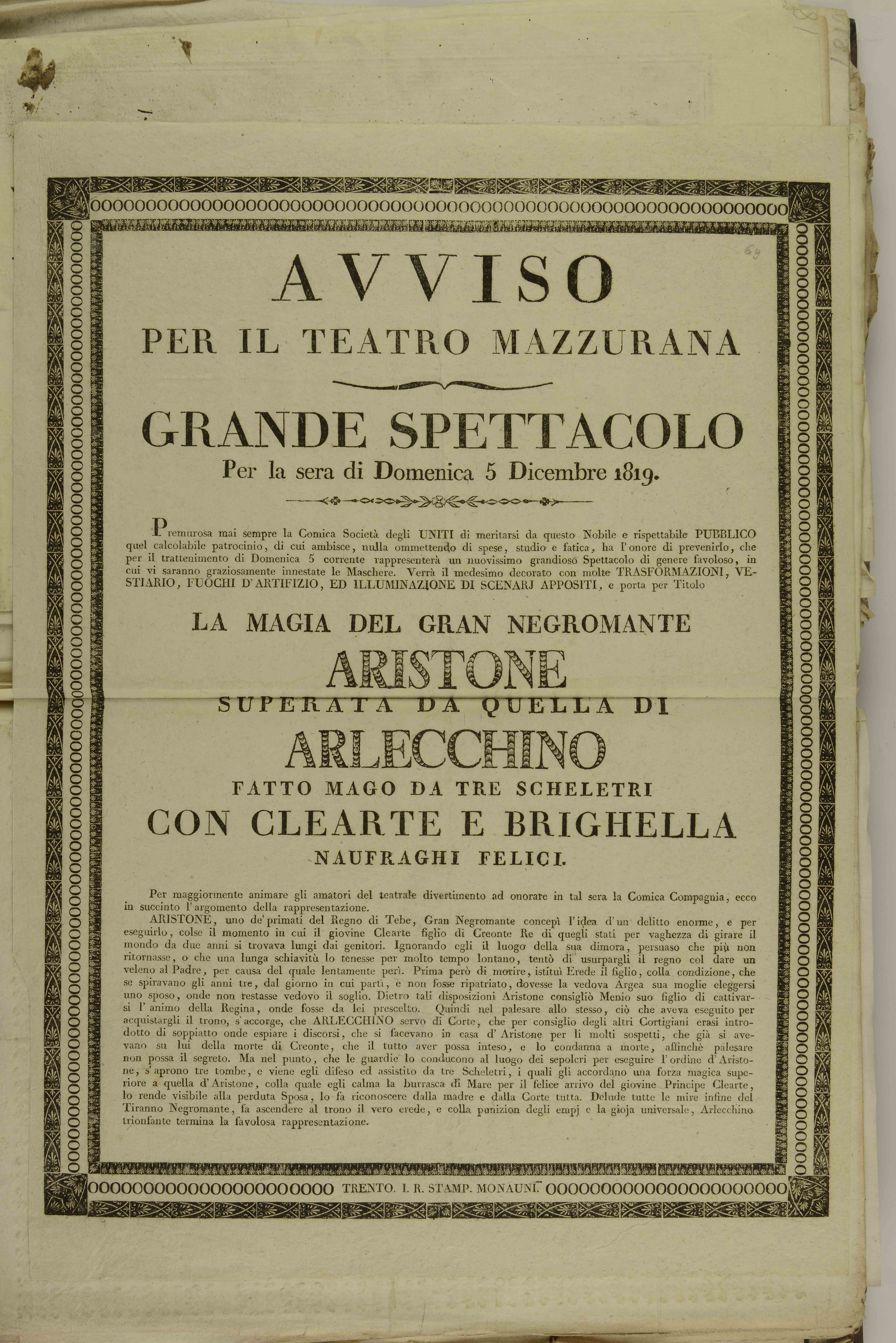 | Avviso per il teatro Mazzurana. Grande spettacolo per la sera di domenica 5 dicembre 1819 |