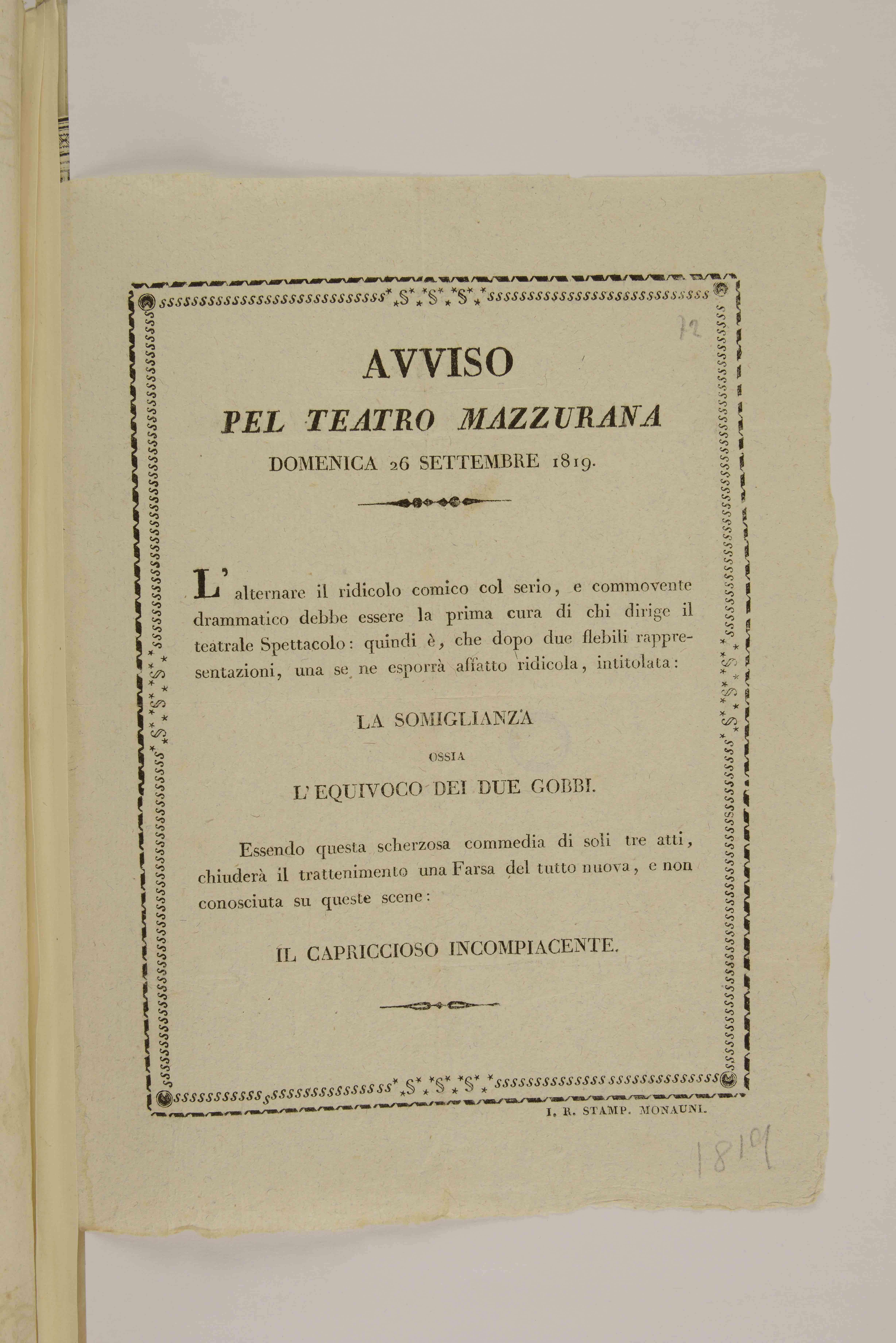 | Avviso per il teatro Mazzurana domenica 26 settembre 1819 |