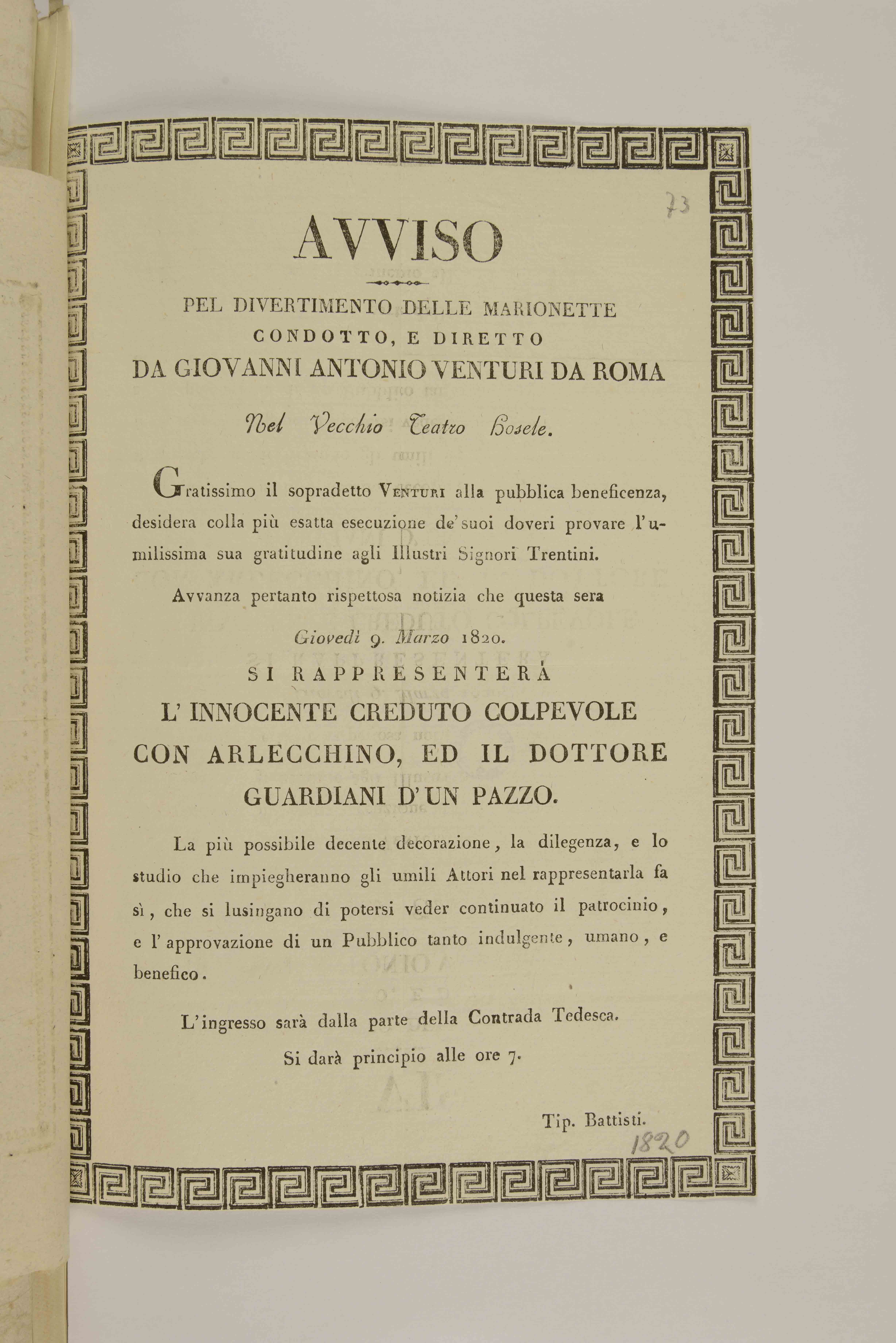 | Avviso. Pel divertimento delle marionette condotto e diretto da Giovanni Antonio Venturi da Roma nel vecchio teatro Hosele |