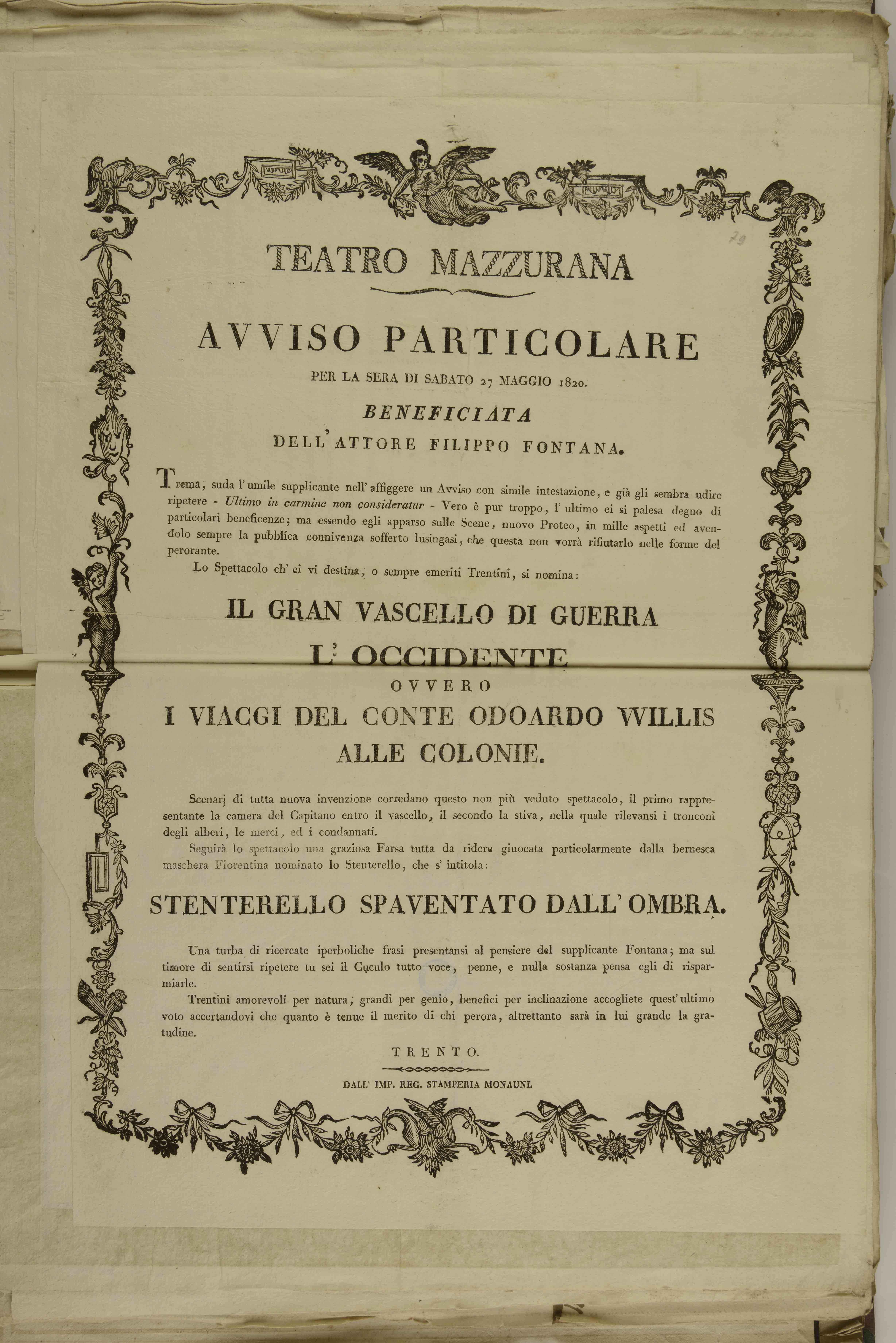 | Teatro Mazzurana. Avviso particolare per la sera di sabato 27 maggio 1820. beneficiata dell'attore Filippo Fontana |