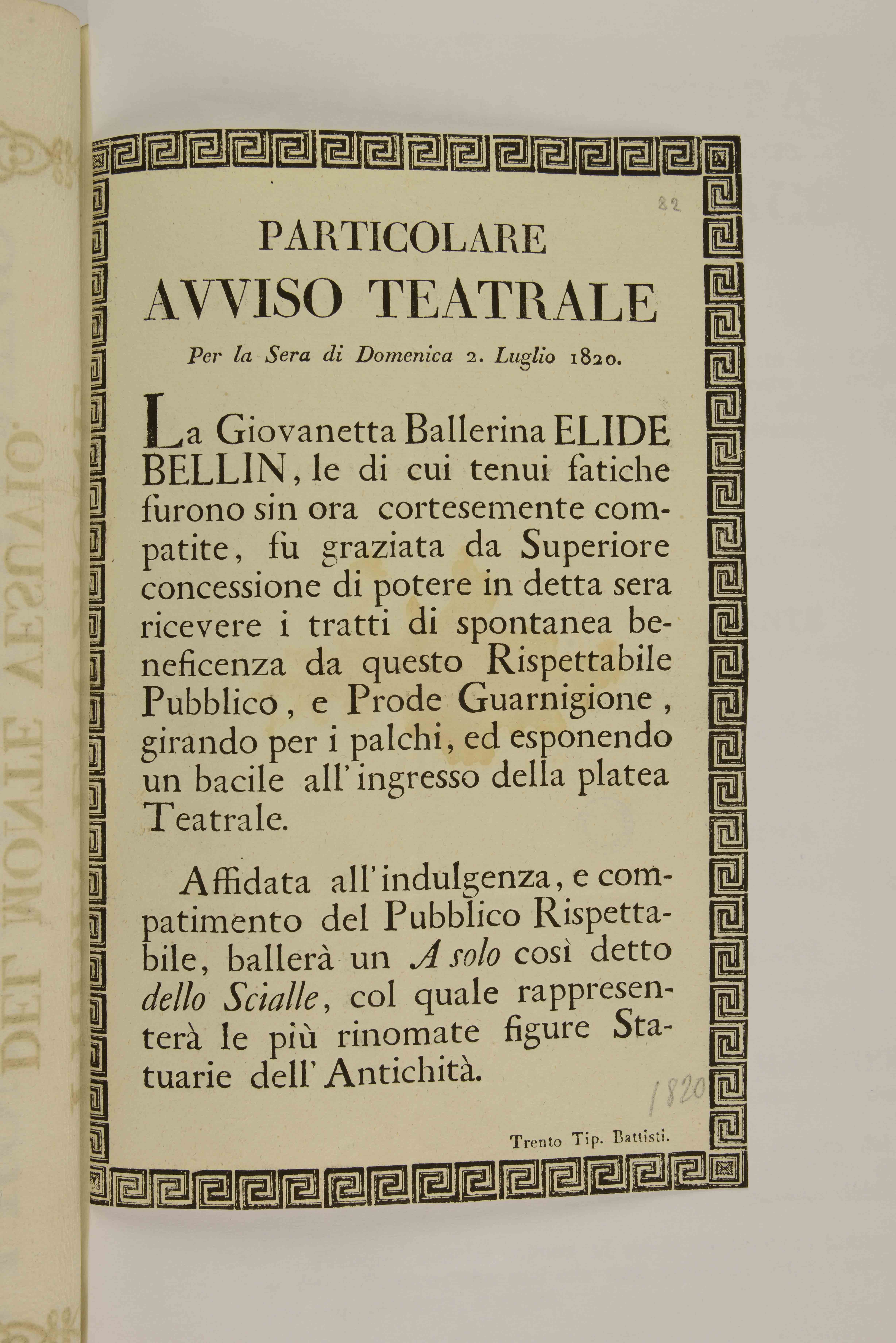 Particolare avviso teatrale per la sera di domenica 2. luglio 1820