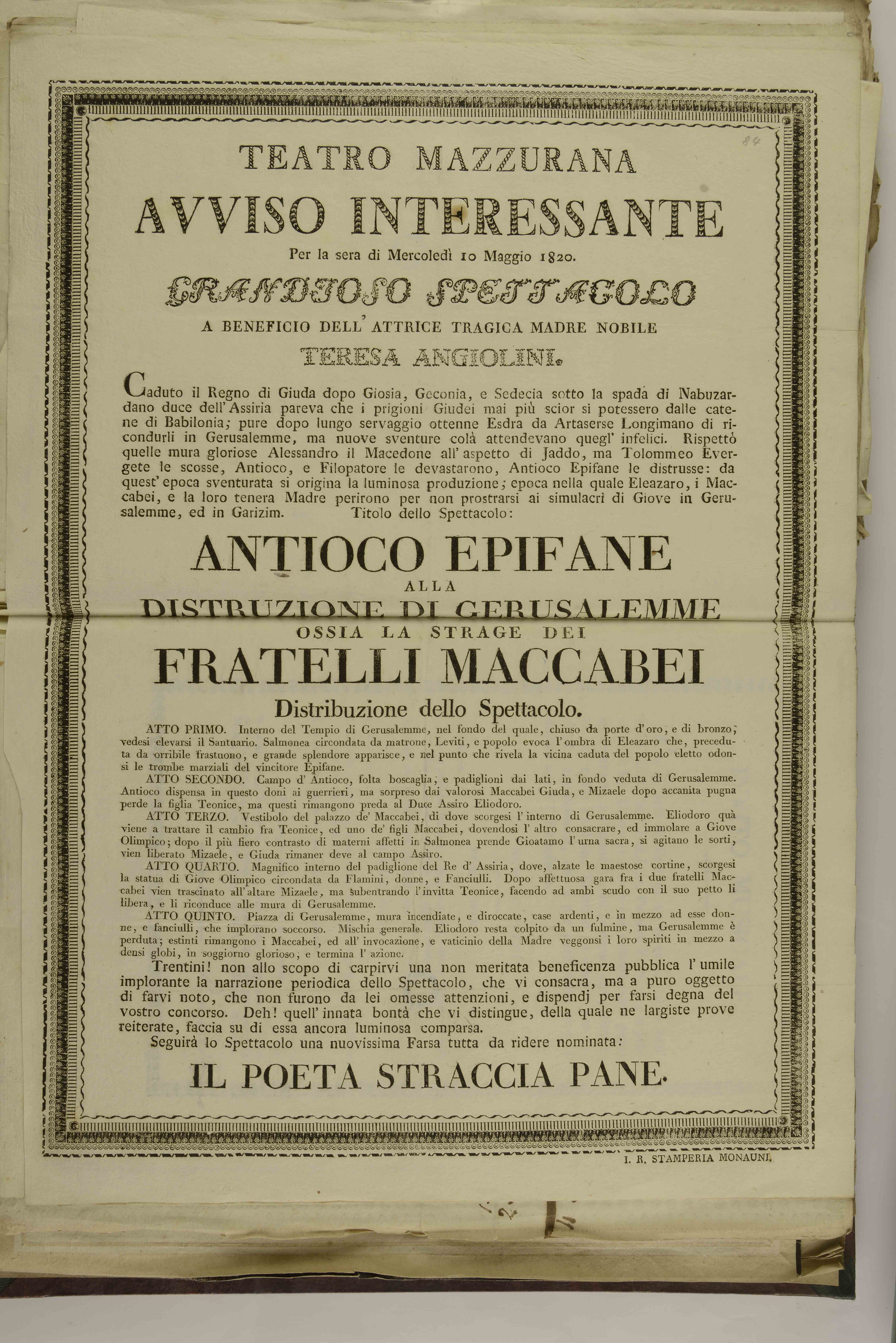 | Teatro Mazzurana. Avviso interessante per la sera di mercoledì 10 maggio 1820. Grandioso spettacolo a beneficio dell'attrice tragica madre nobile Teresa Angiolini |