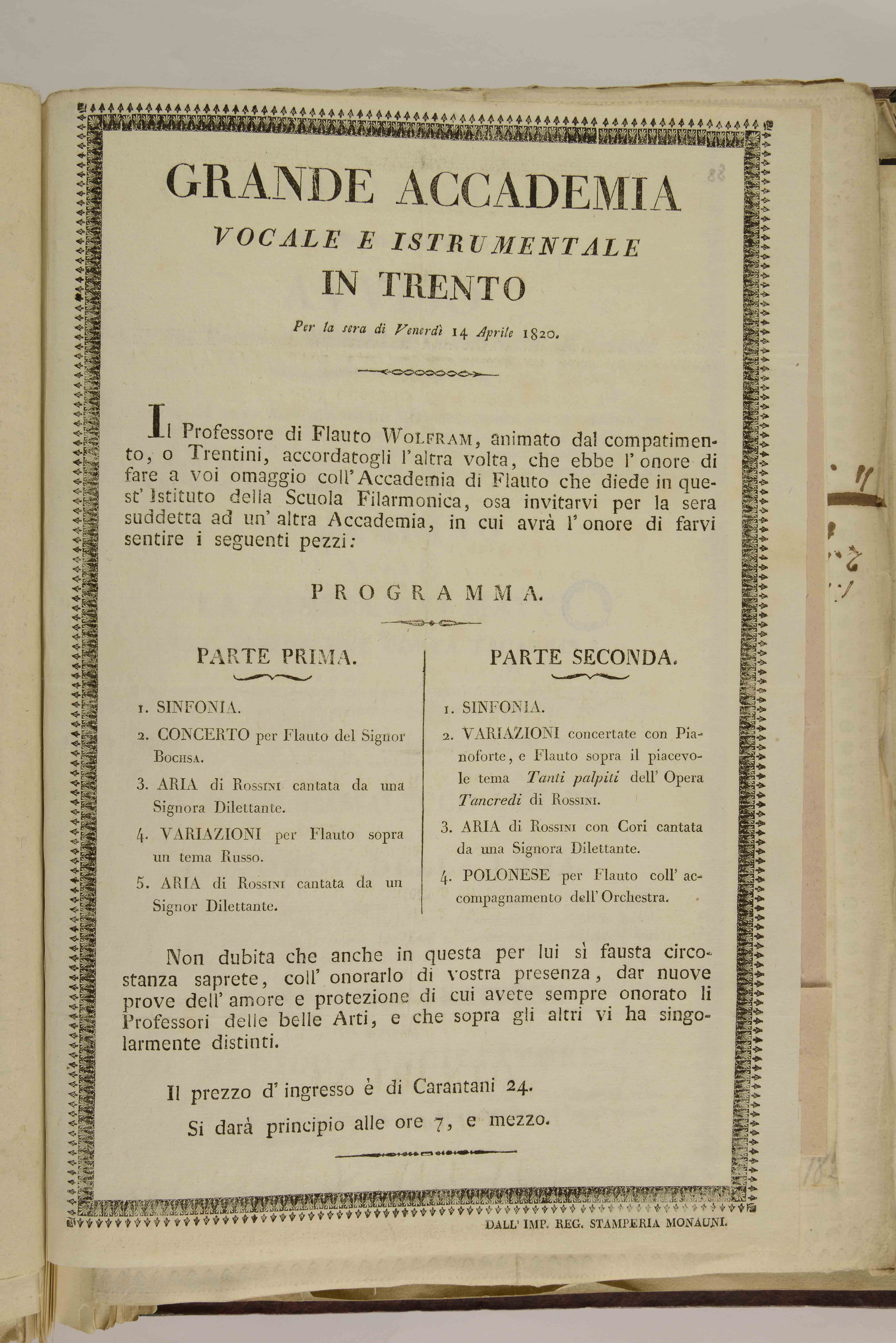 | Grande accademia vocale e istrumentale in Trento per la sera di venerdì 14 aprile 1820 |