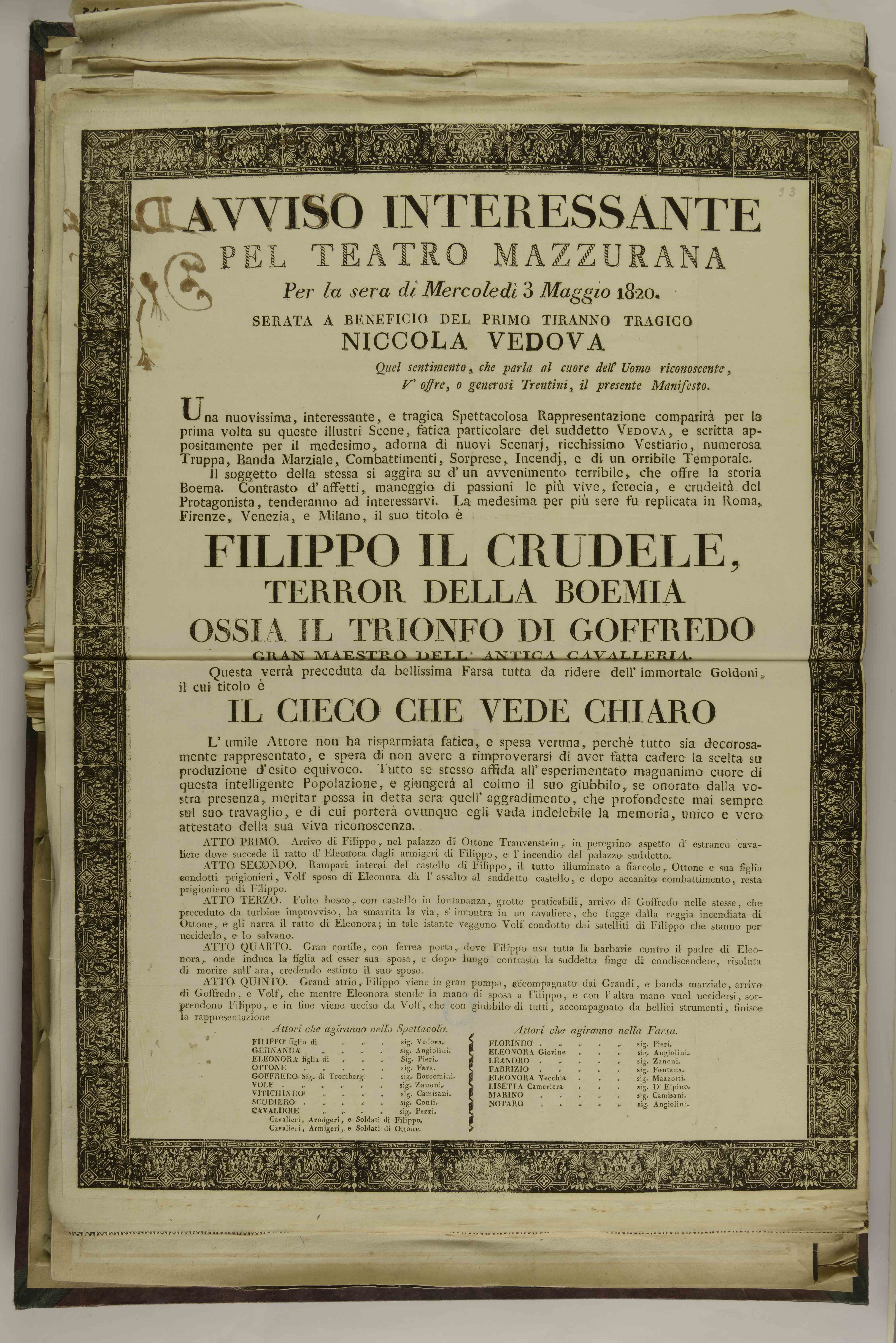 | Avviso interessante pel teatro Mazzurana. Per la sera di mercoledì 3 maggio 1820. Serata a beneficio del primo tiranno tragico Niccola Vedova |