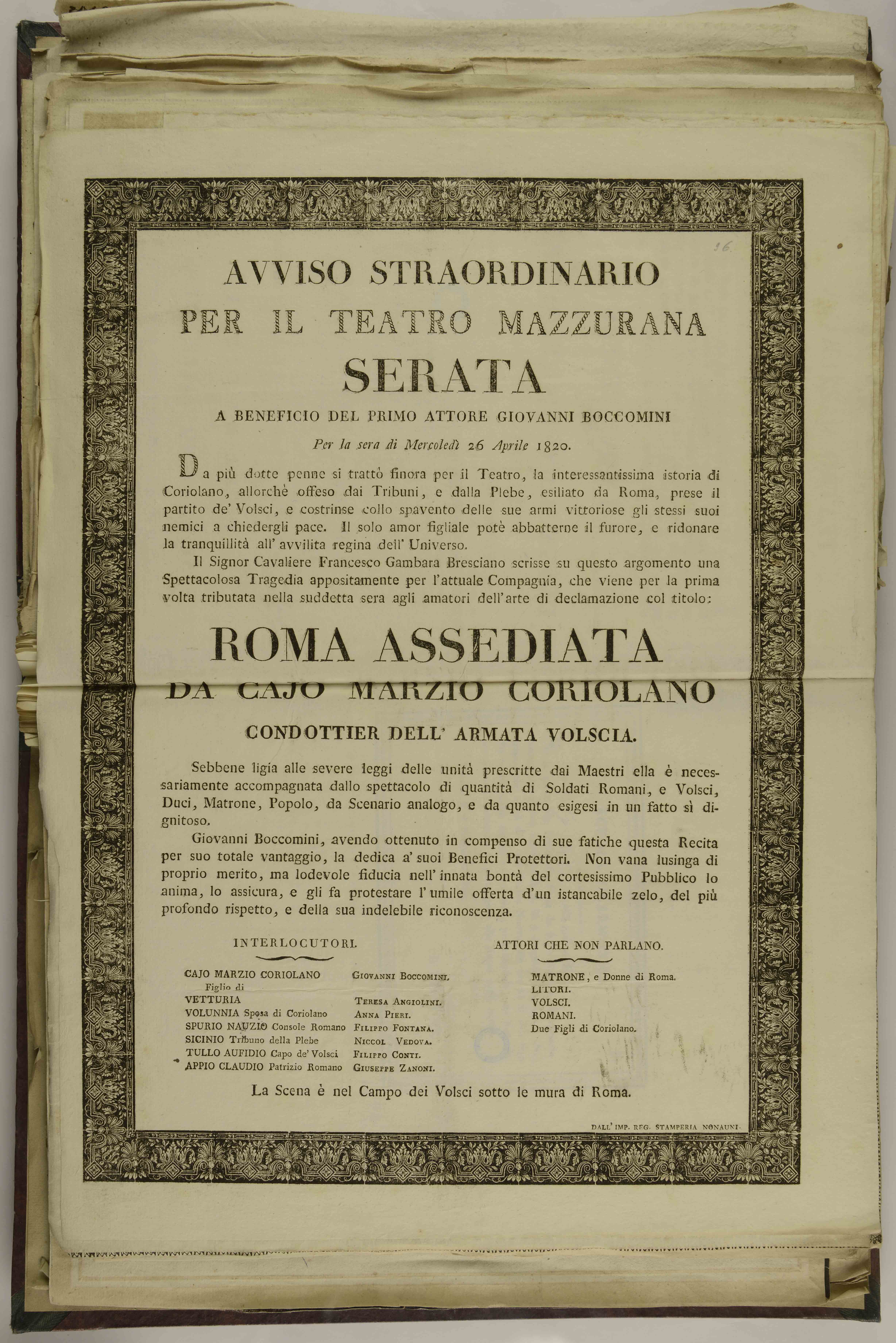 | Avviso straordinario per il teatro Mazzurana. Serata a beneficio del primo attore Giovanni Boccomini per la sera di mercoledì 26 aprile 1820 |