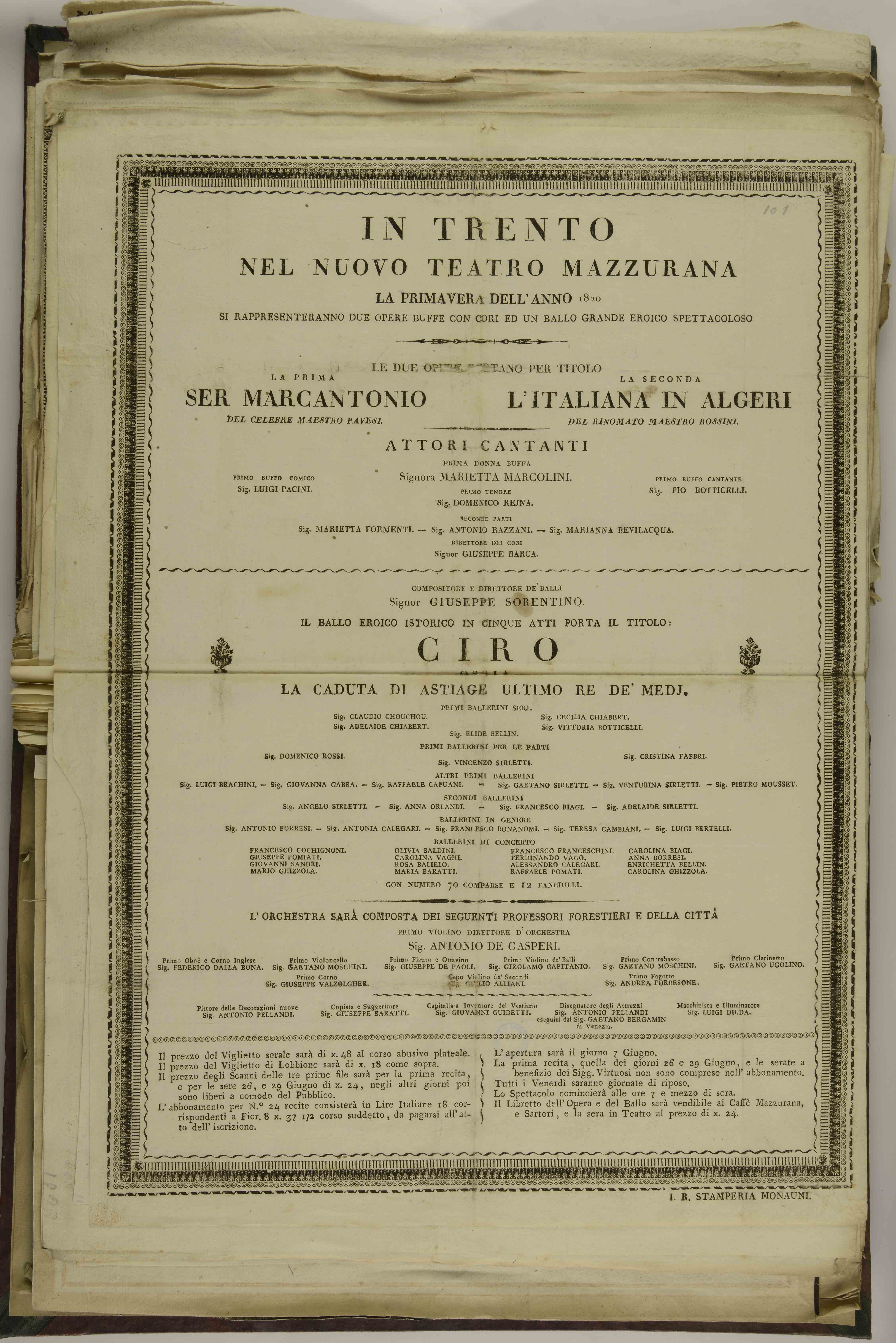 | In Trento nel nuovo teatro Mazzurana la primavera dell'anno 1820 si rappresenteranno due opere buffe con cori ed un ballo grande eroico spettacoloso |