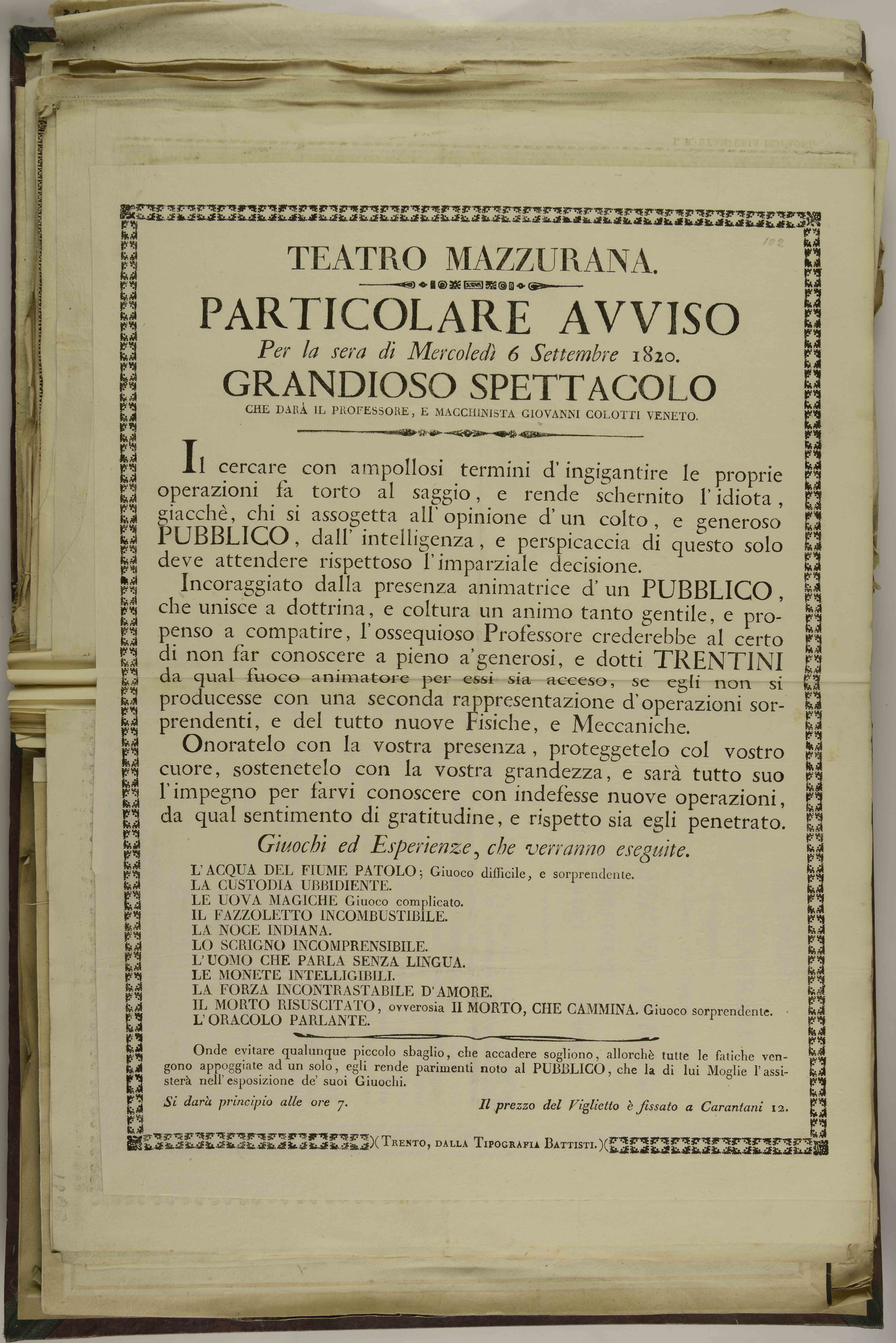 | Teatro Mazzurana. Particolare avviso per la sera di mercoledì 6 settembre 1820. Grandioso spettacolo che darà il professore, e macchinista Giovanni Colotti veneto |