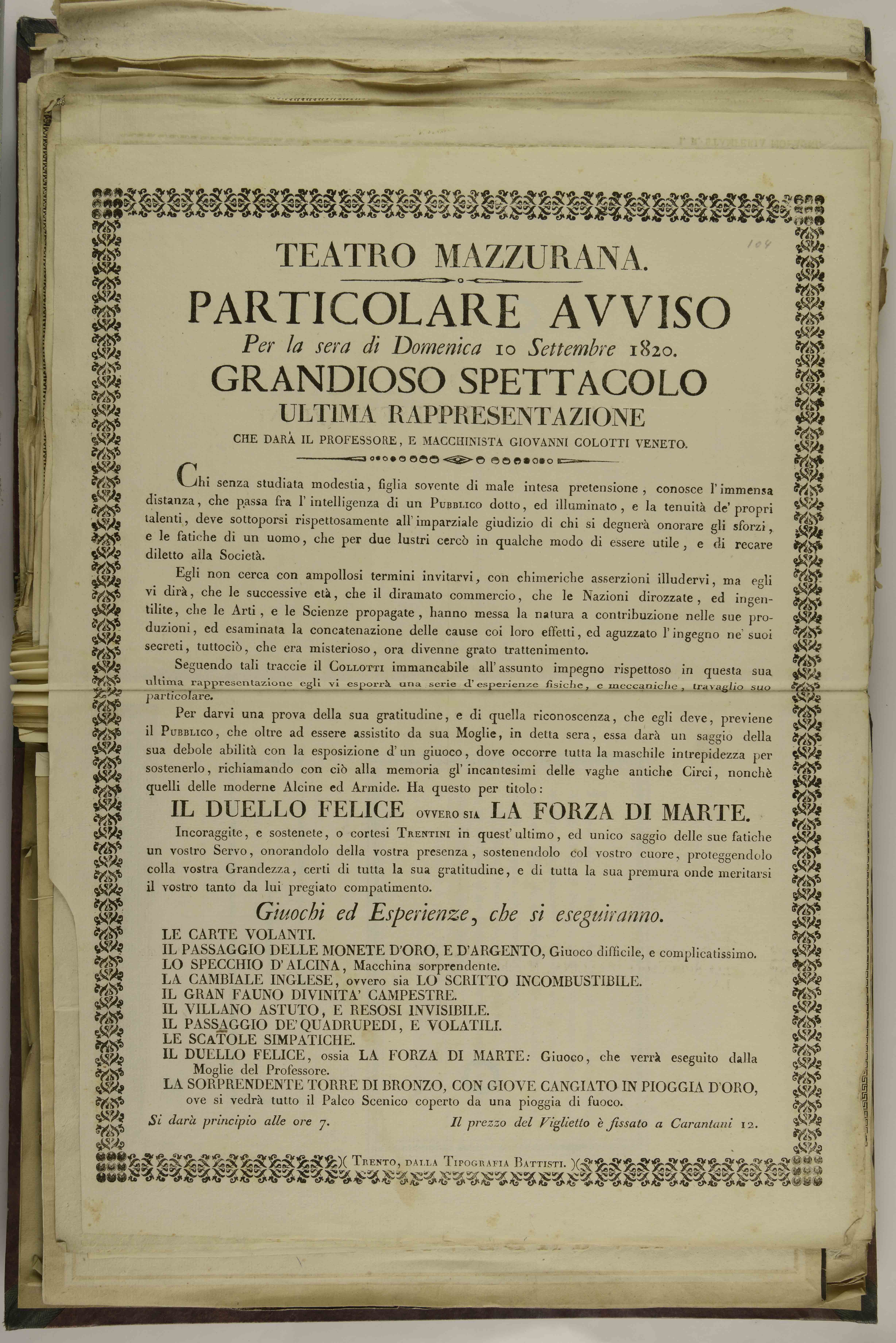 | Teatro Mazzurana. Particolare avviso per la sera di domenica 10 settembre 1820. Grandioso spettacolo ultima rappresentazione che darà il professore, e macchinista Giovanni Colotti veneto |