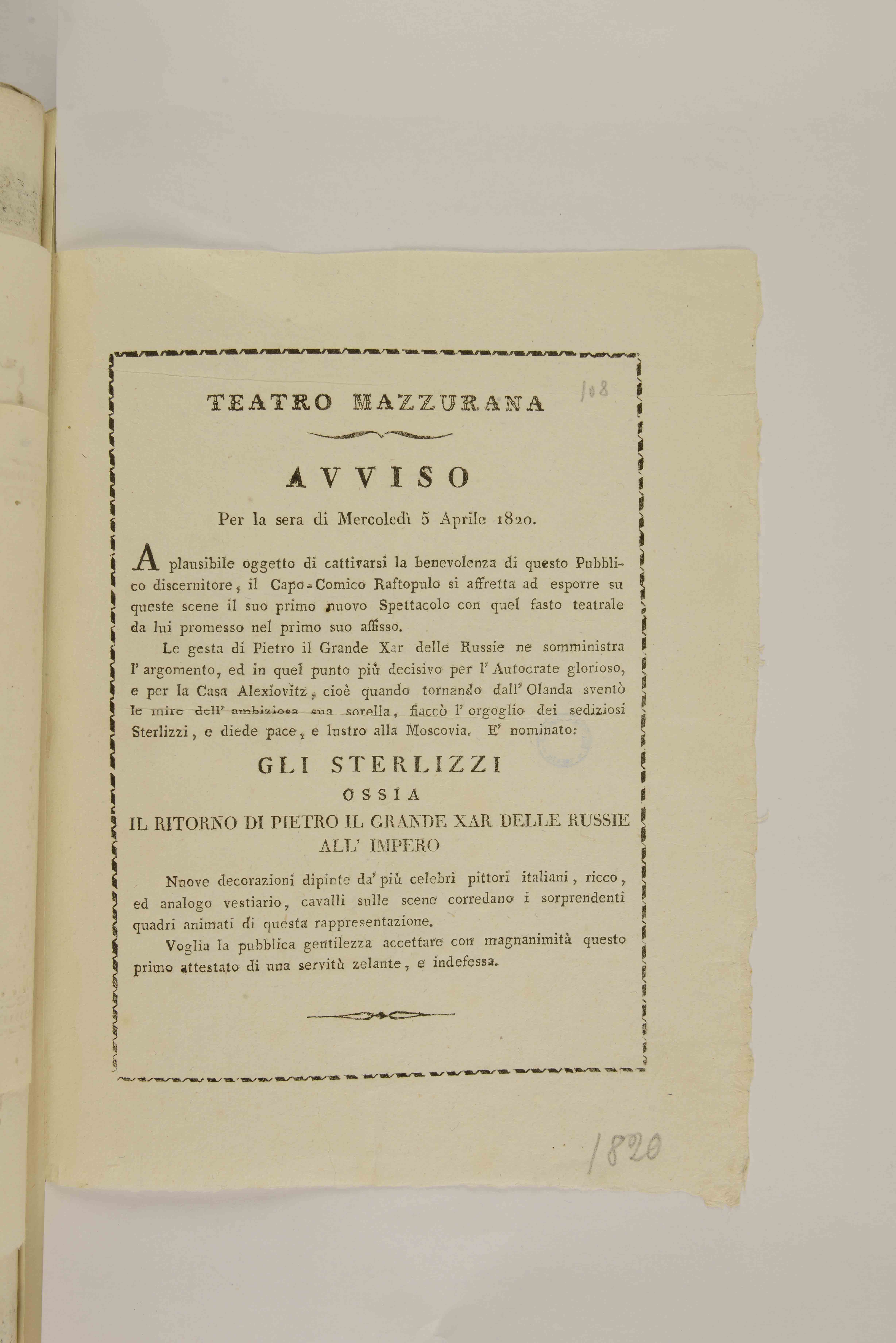 | Teatro Mazzurana. Avviso per la sera di mercoledì 5 aprile 1820 |