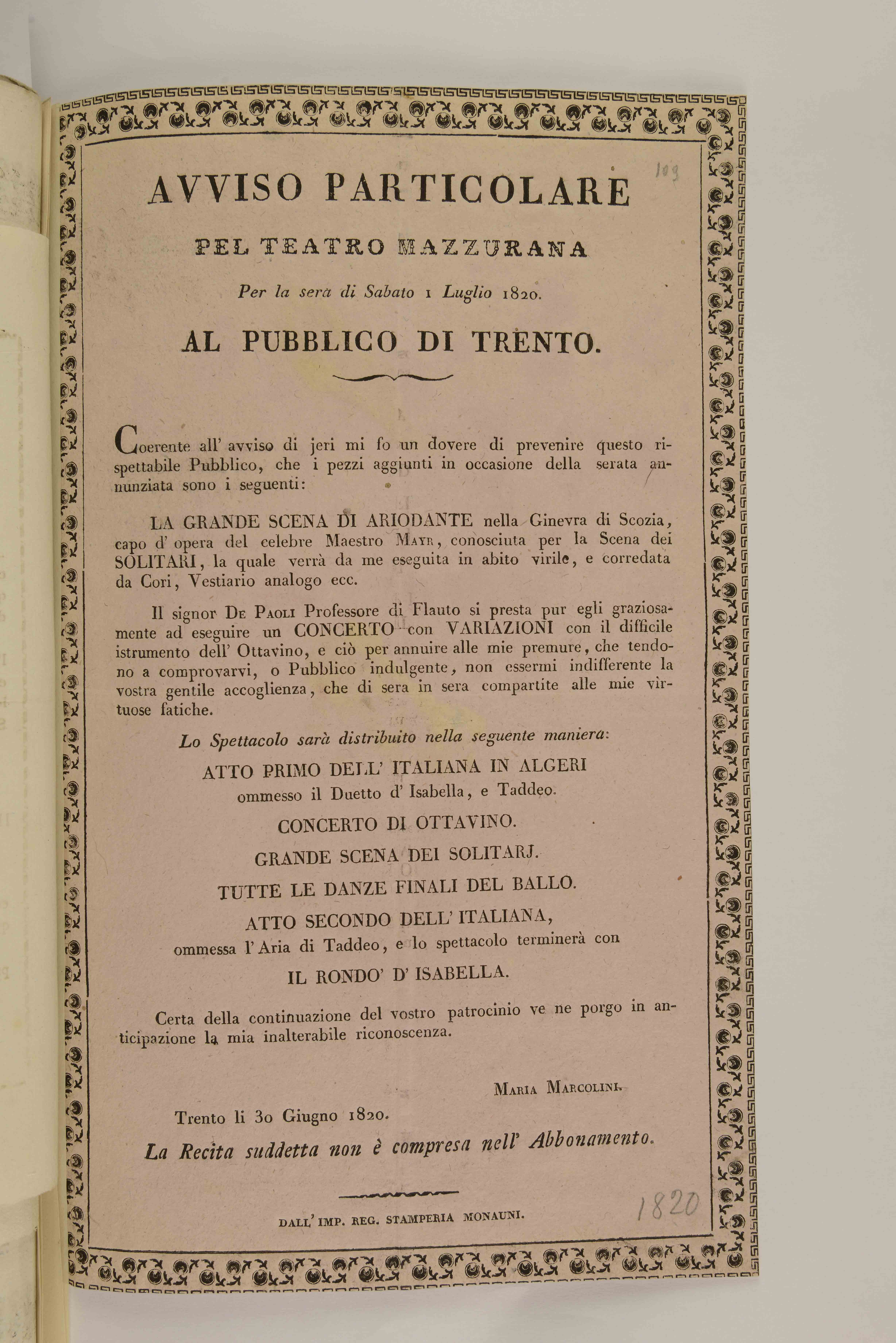 | Avviso particolare pel teatro Mazzurana. Per la sera di sabato 1 luglio 1820. Al pubblico di Trento |