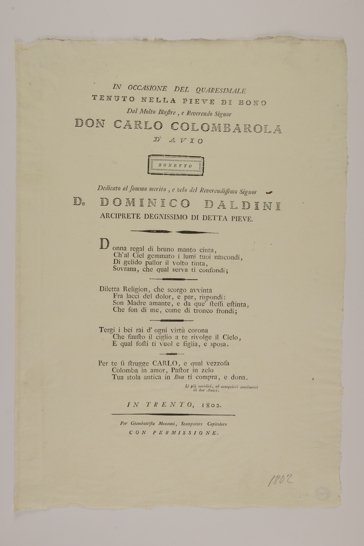 | In occasione del quaresimale tenuto nella Pieve di Bono dal molto illustre e reverendo signor don Carlo Colombarola d'Avio, sonetto |