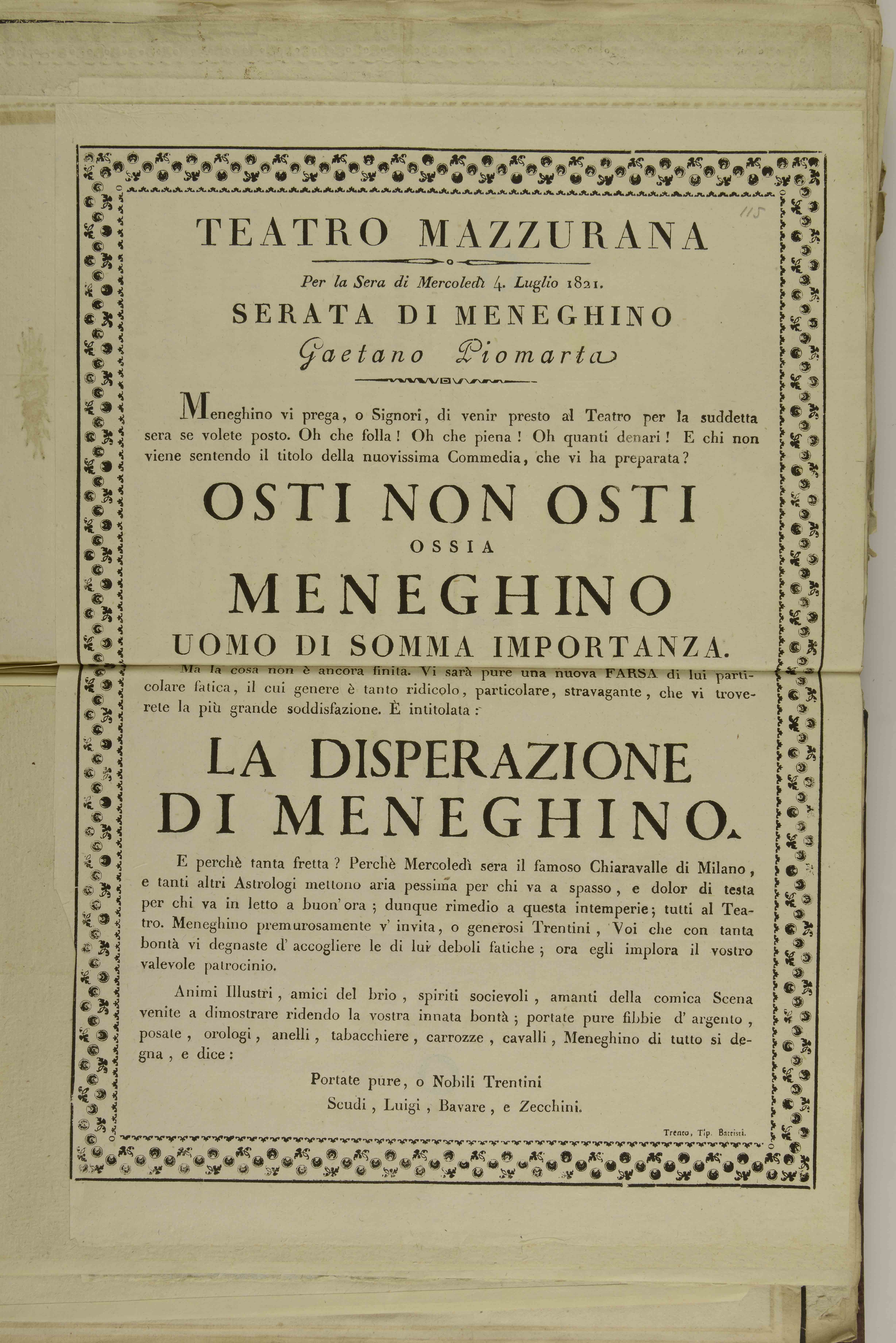 | Teatro Mazzurana. Per la sera di mercoledì 4 luglio 1821. Serata di Meneghino |