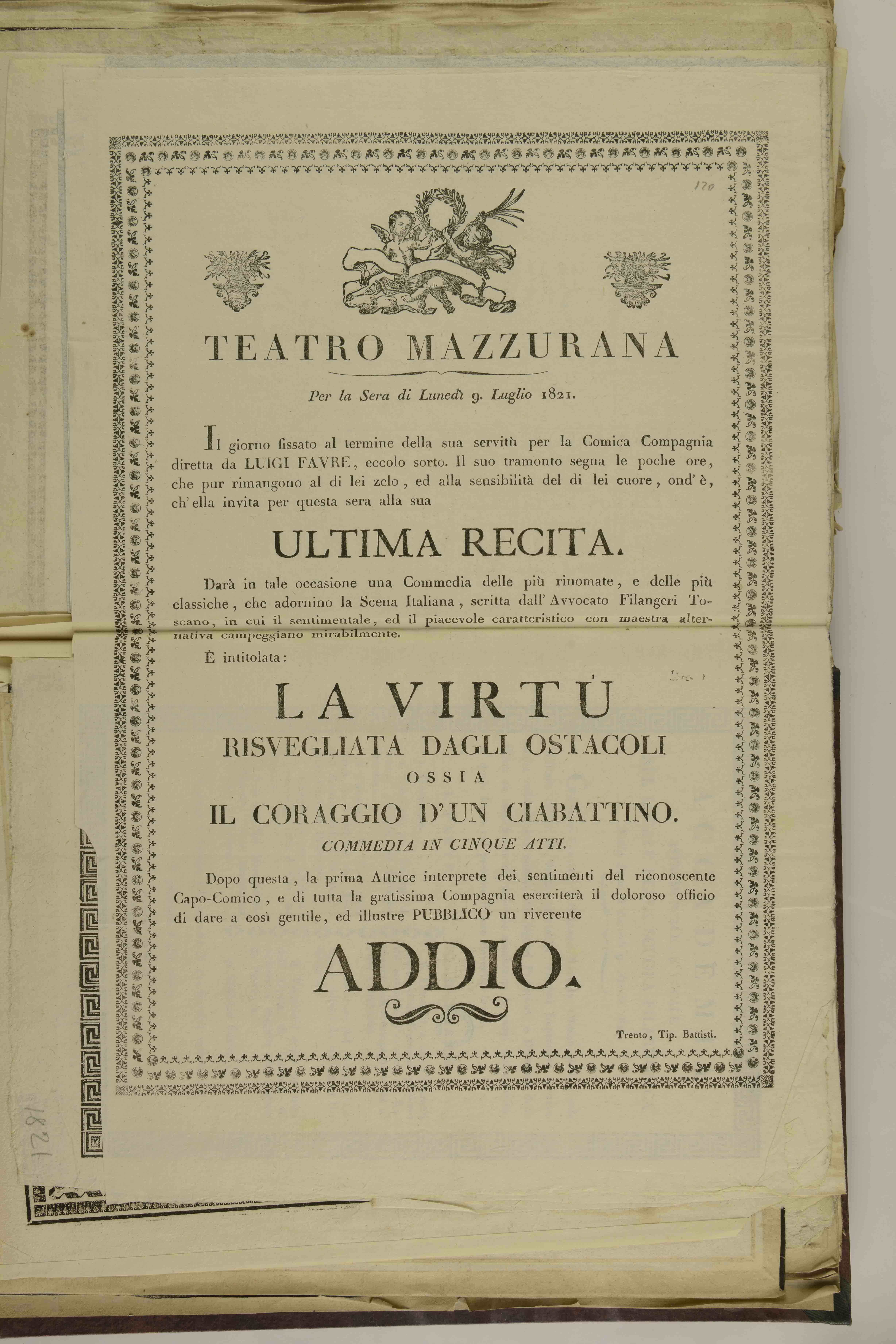 | Teatro Mazzurana. Per la sera di lunedì 9 luglio 1821 |