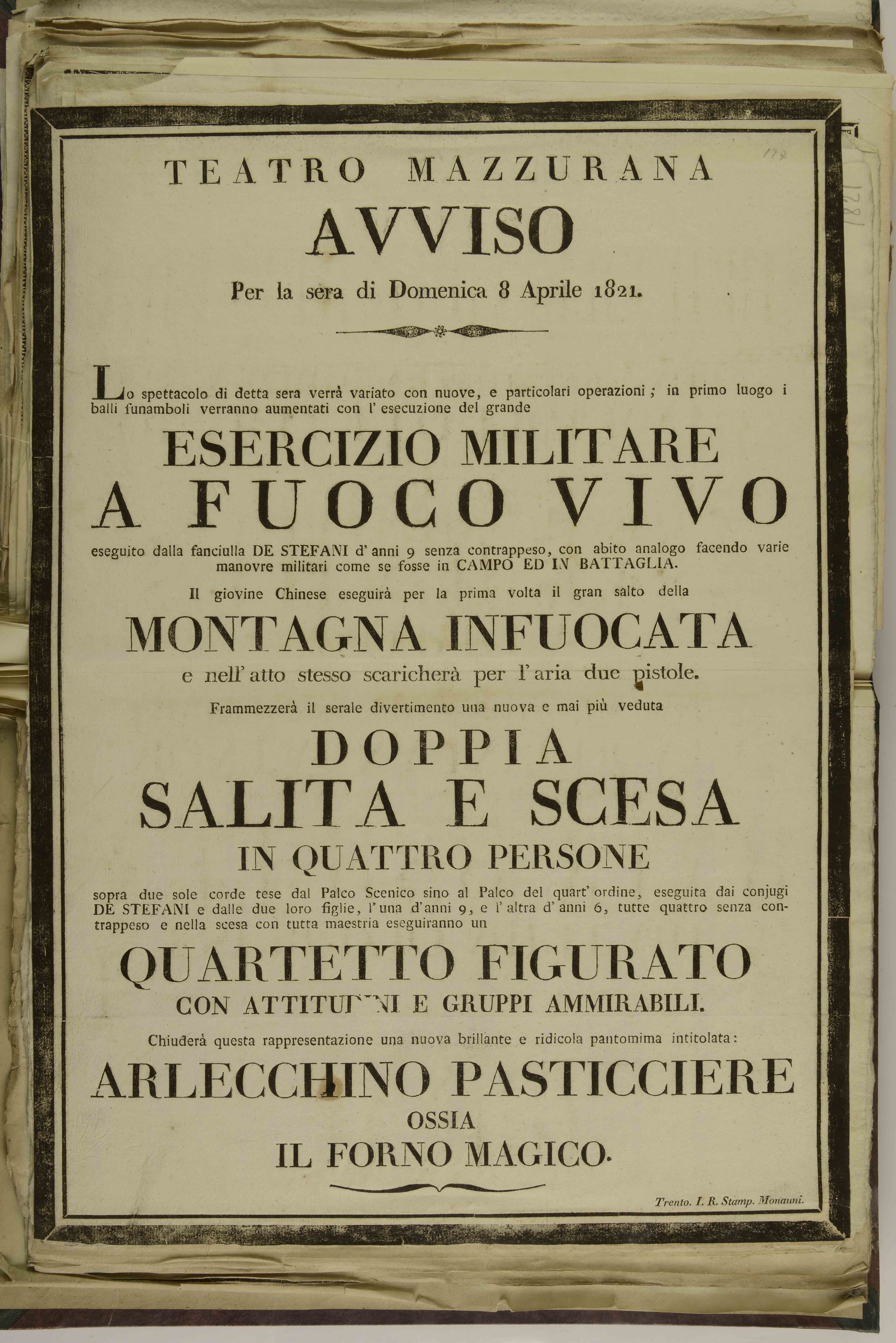 | Teatro Mazzurana. Avviso per la sera di domenica 8 aprile 1821 |