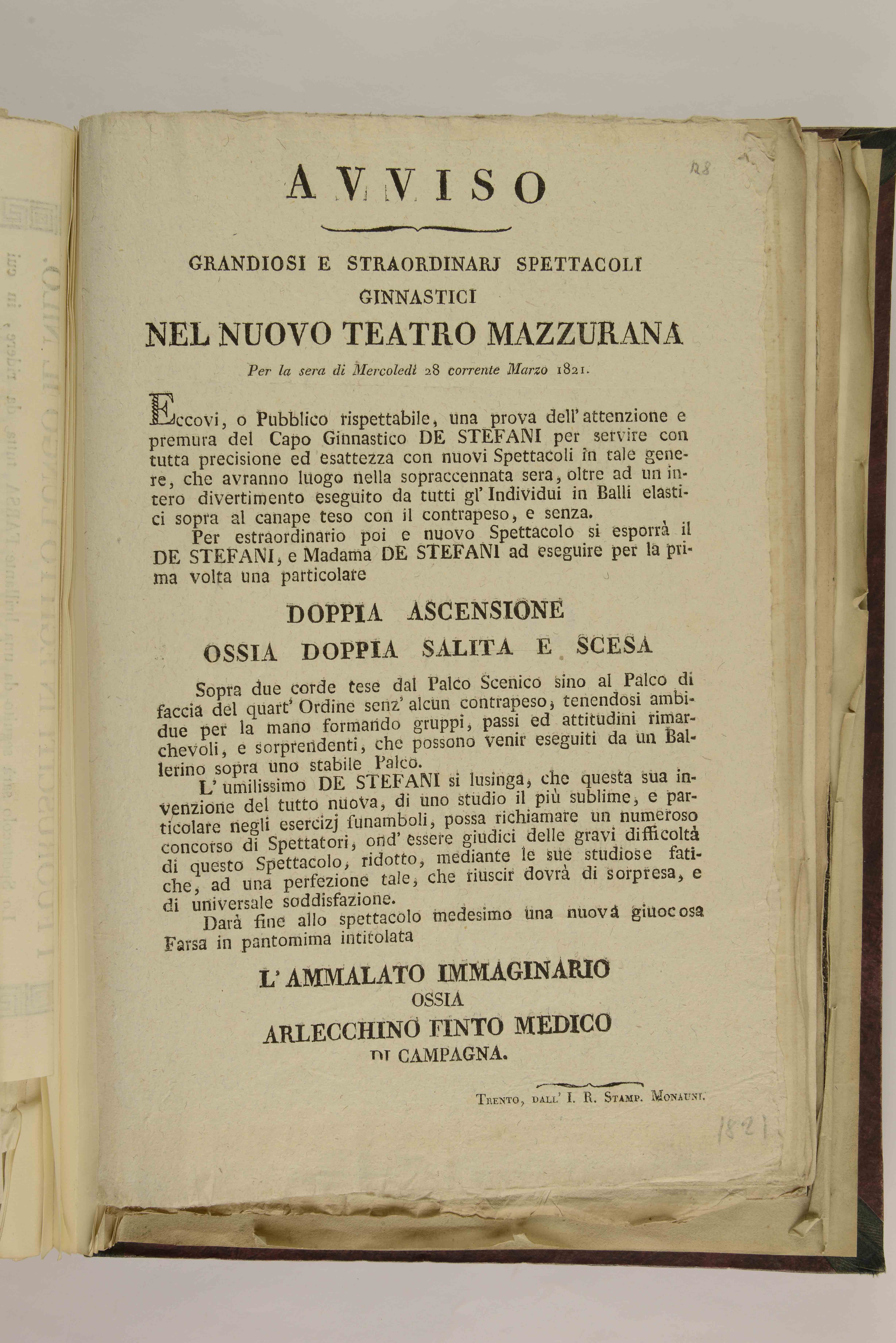 | Avviso. Grandiosi e straordinarj spettacoli ginnastici nel nuovo teatro Mazzurana per la sera di mercoledì 28 corrente marzo 1821 |