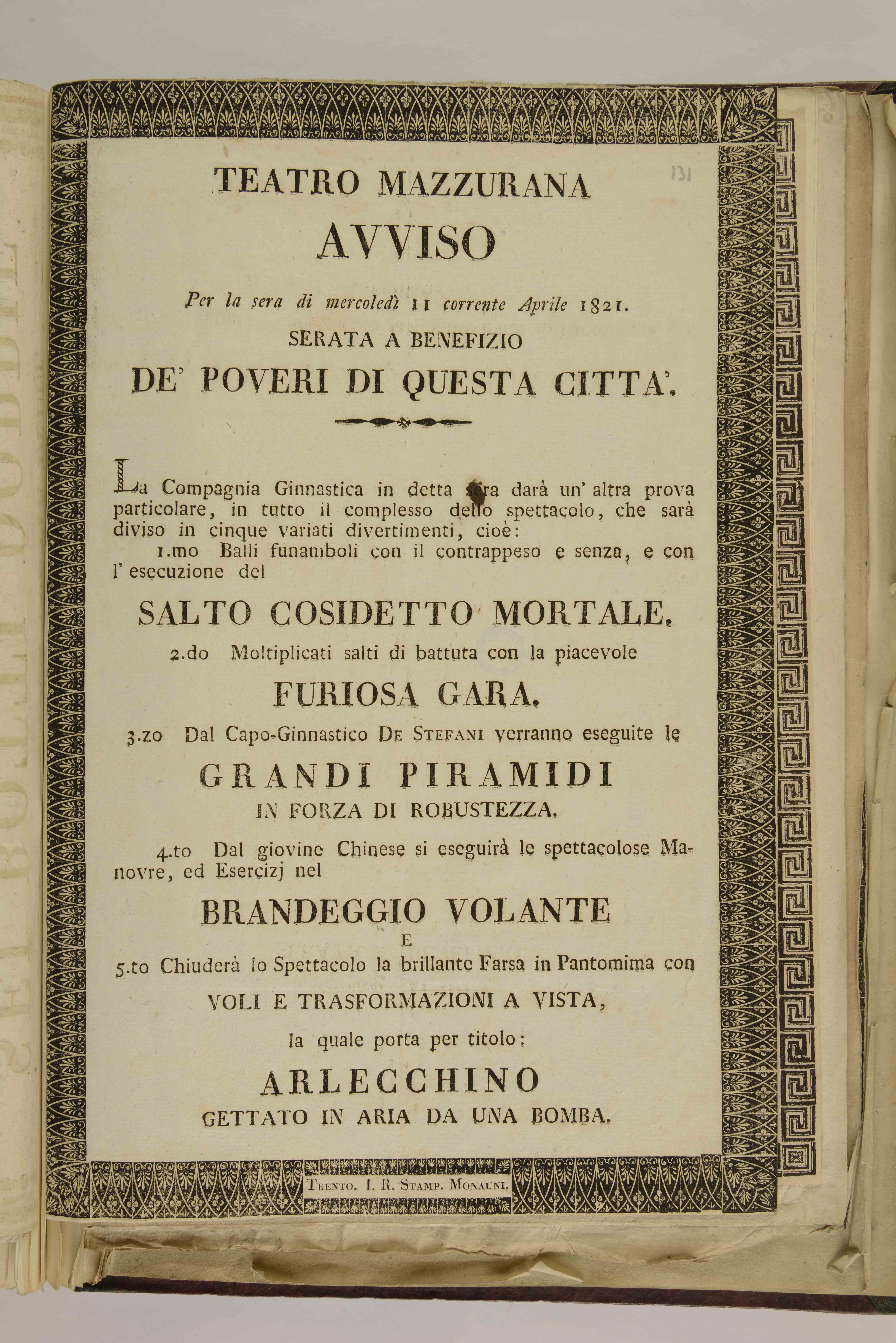 | Teatro Mazzurana. Avviso per la sera di mercoledì 11 corrente aprile 1821. Serata a benefizio de' poveri di questa città |