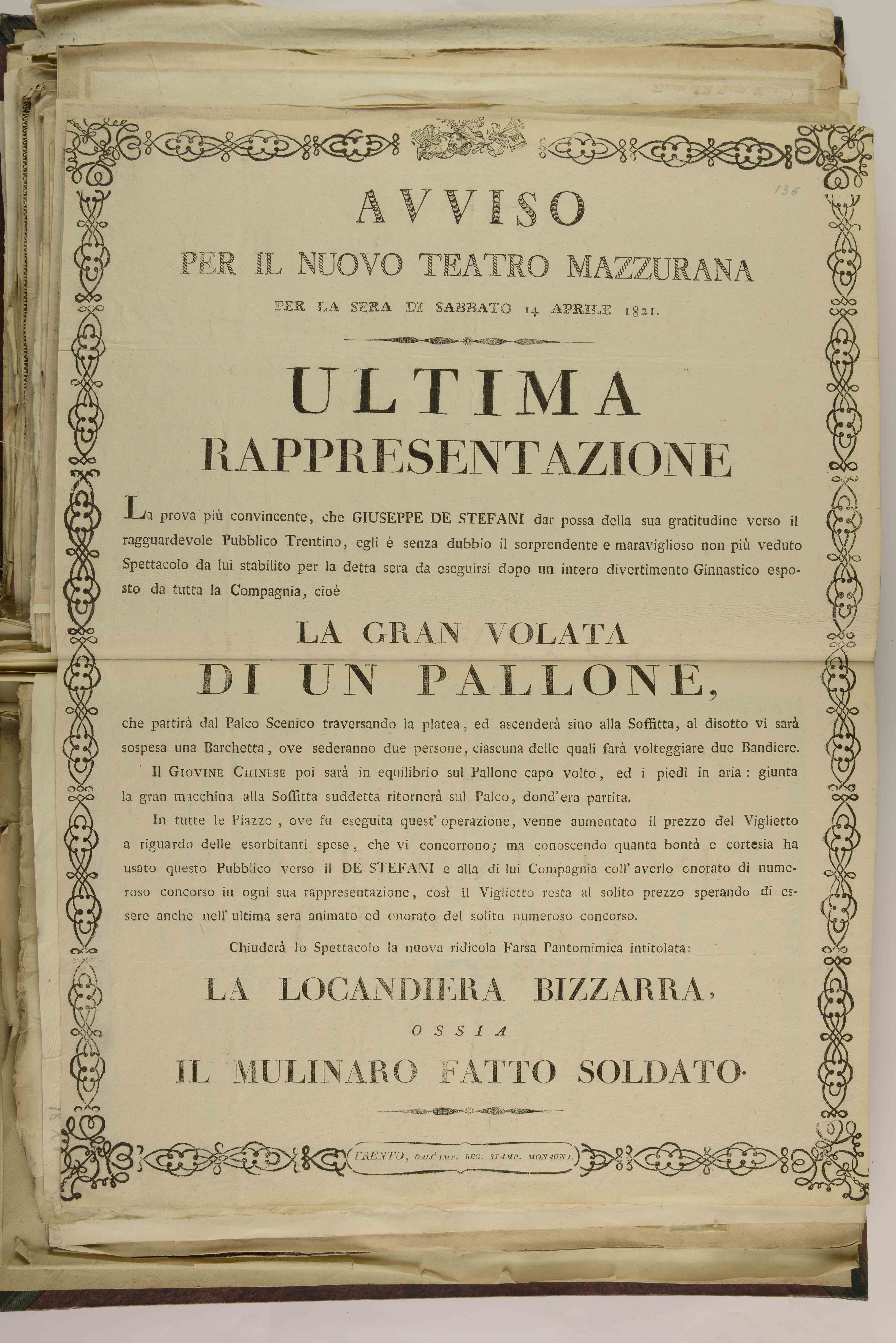 Avviso per il nuovo teatro Mazzurana per la sera di sabbato 14 aprile 1821