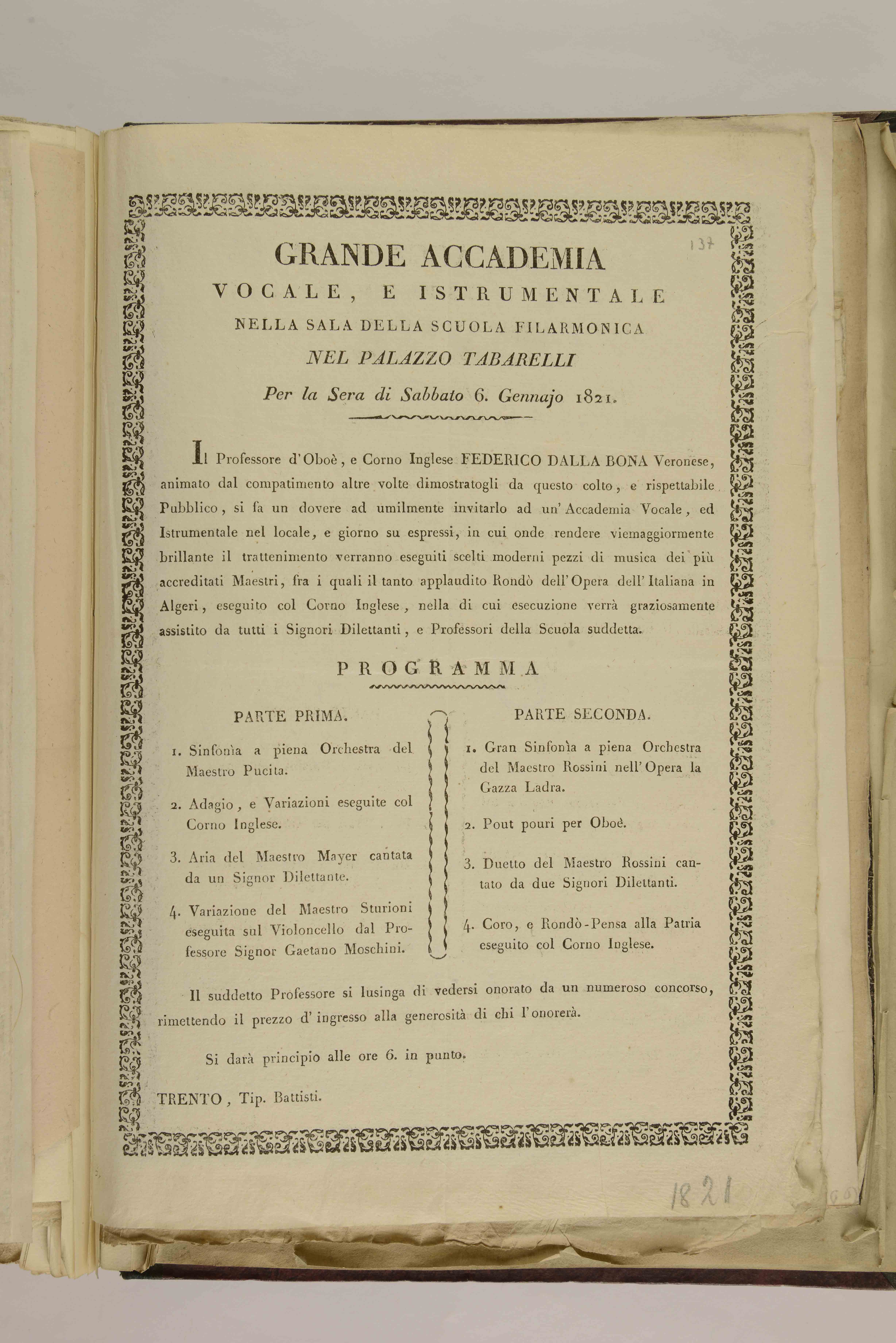 | Grande accademia vocale, e istrumentale nella sala della Scuola filarmonica nel palazzo Tabarelli per la sera di sabbato 6 gennajo 1821 |