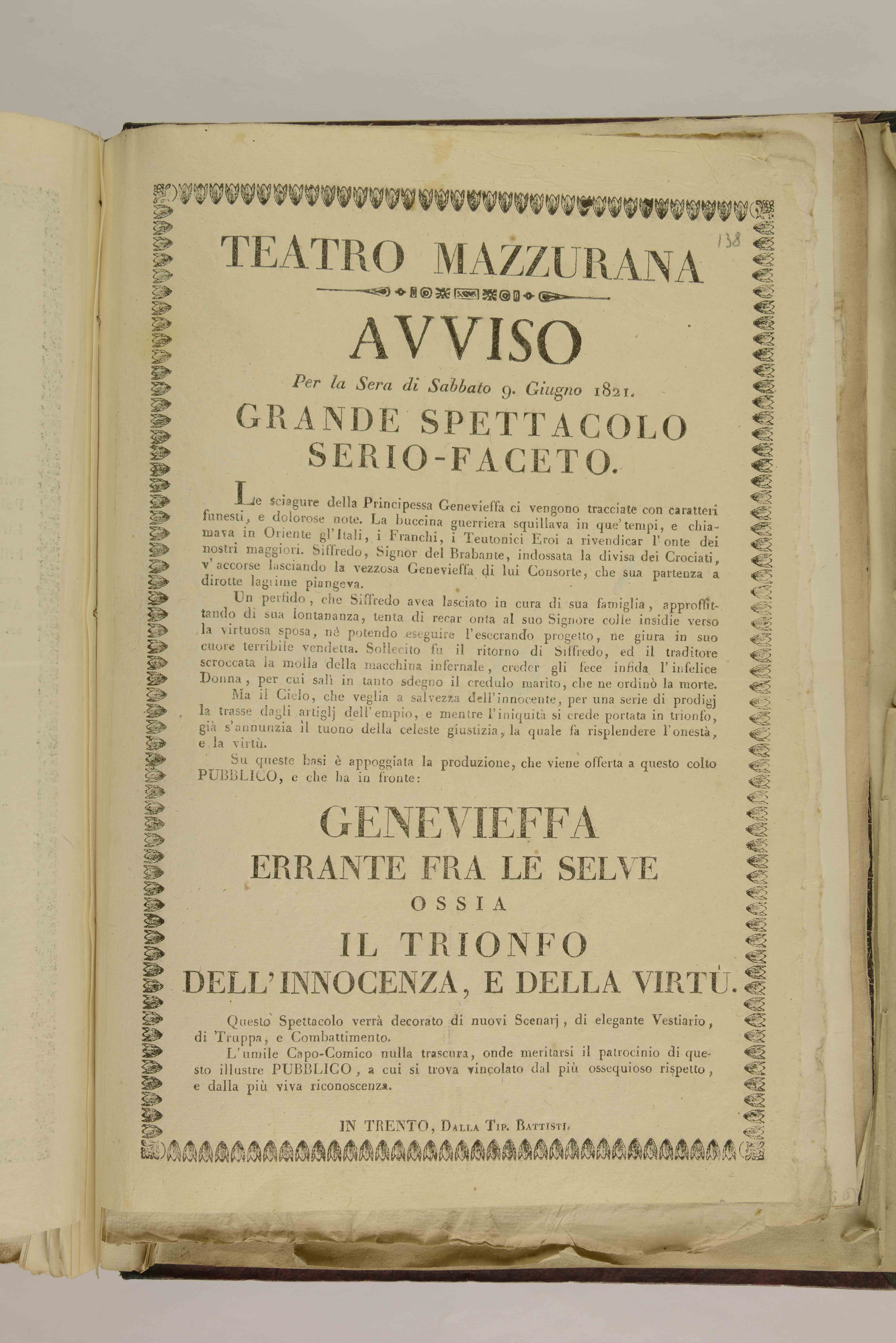 | Teatro Mazzurana. Avviso per la sera di sabbato 9 giugno 1821. Grande spettacolo serio-faceto |