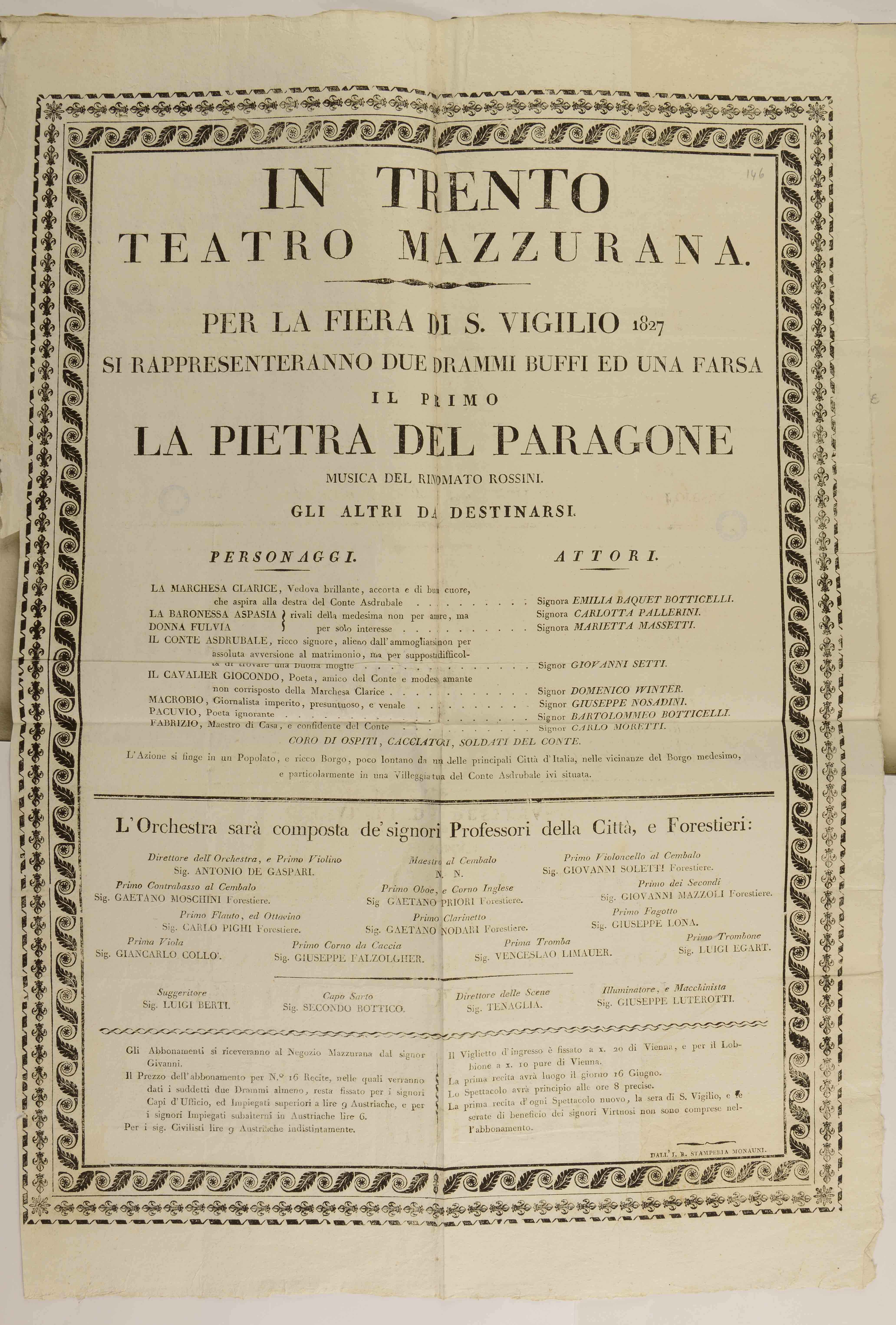 | In Trento. Teatro Mazzurana. Per la fiera di s. Vigilio 1827 si rappresenteranno due drammi buffi ed una farsa |