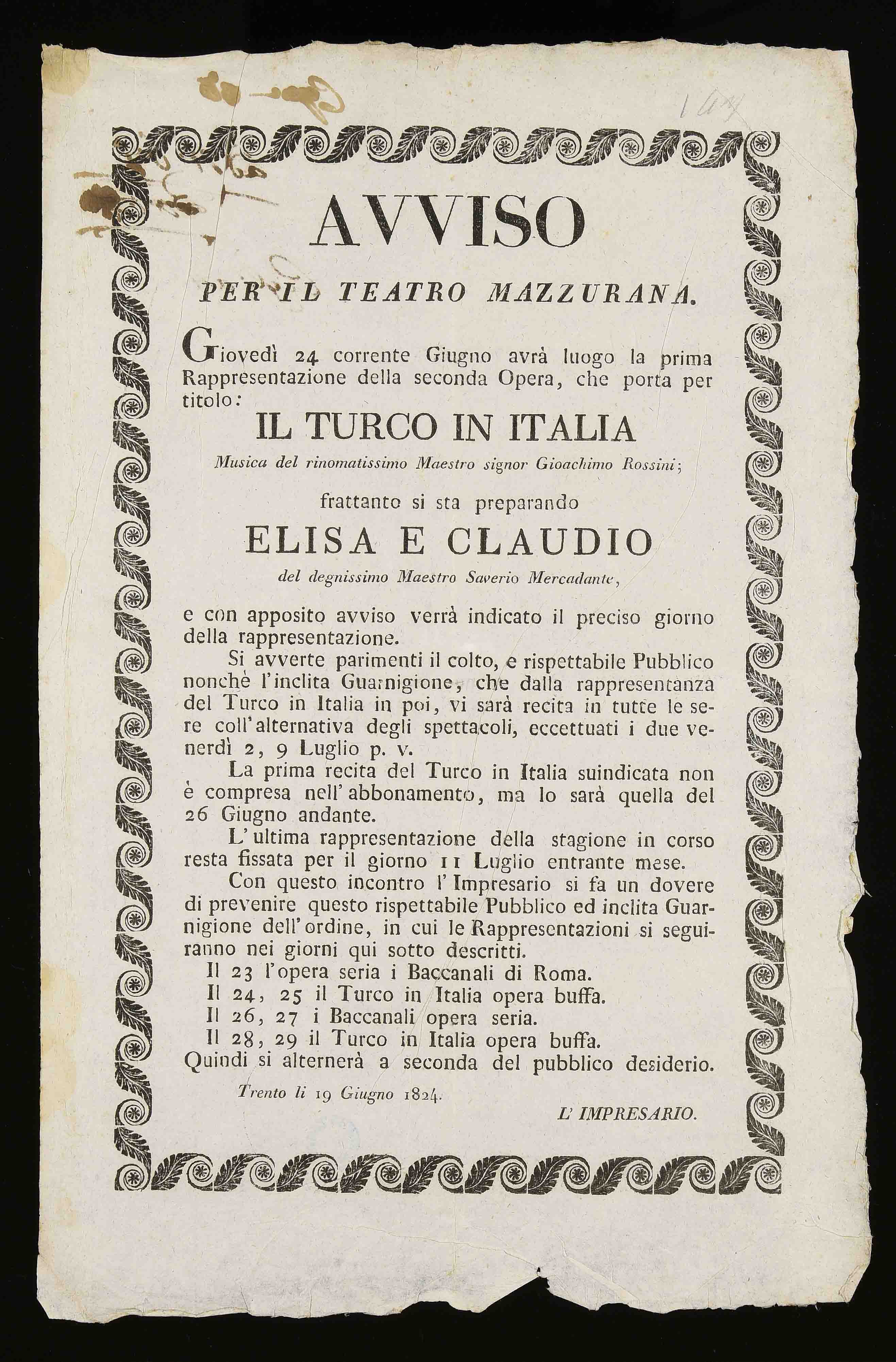 | Avviso per il teatro Mazzurana. Giovedì 24 corrente giugno avrà luogo la prima rappresentazione della seconda opera |