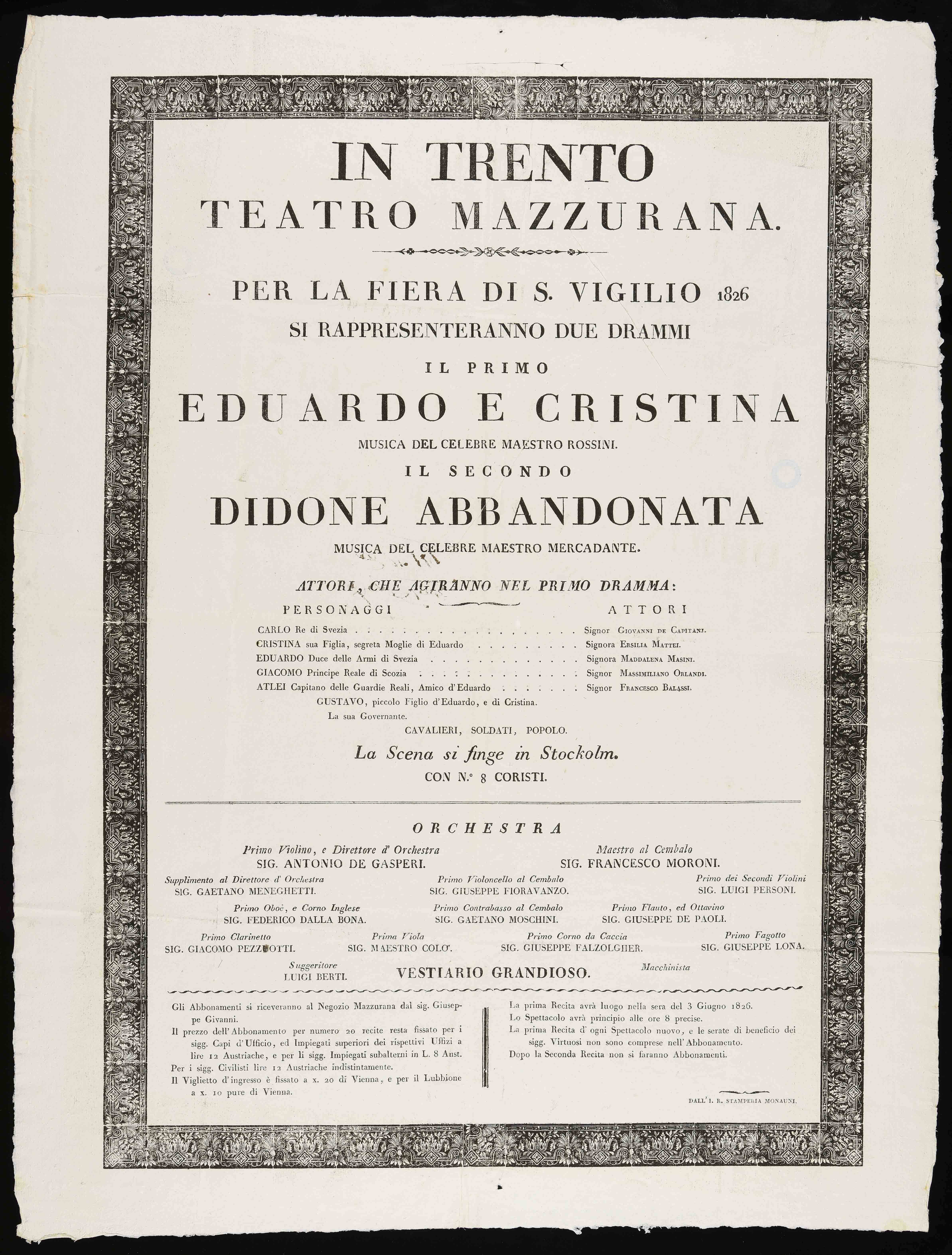 In Trento Teatro Mazzurana. Per la fiera di S. Vigilio 1826 si...