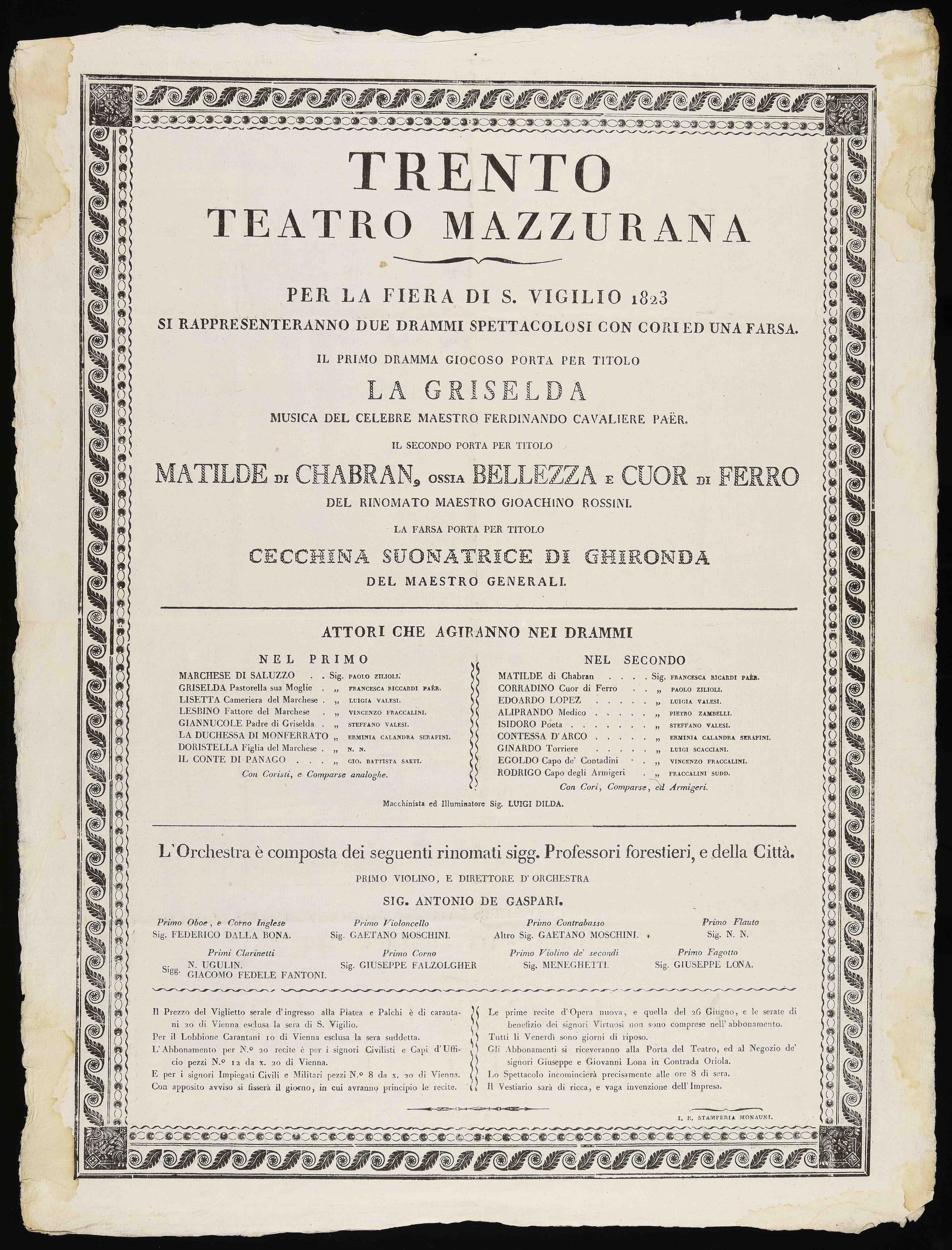 Trento Teatro Mazzurana. Per la fiera di S. Vigilio 1823 si rappresenteranno...