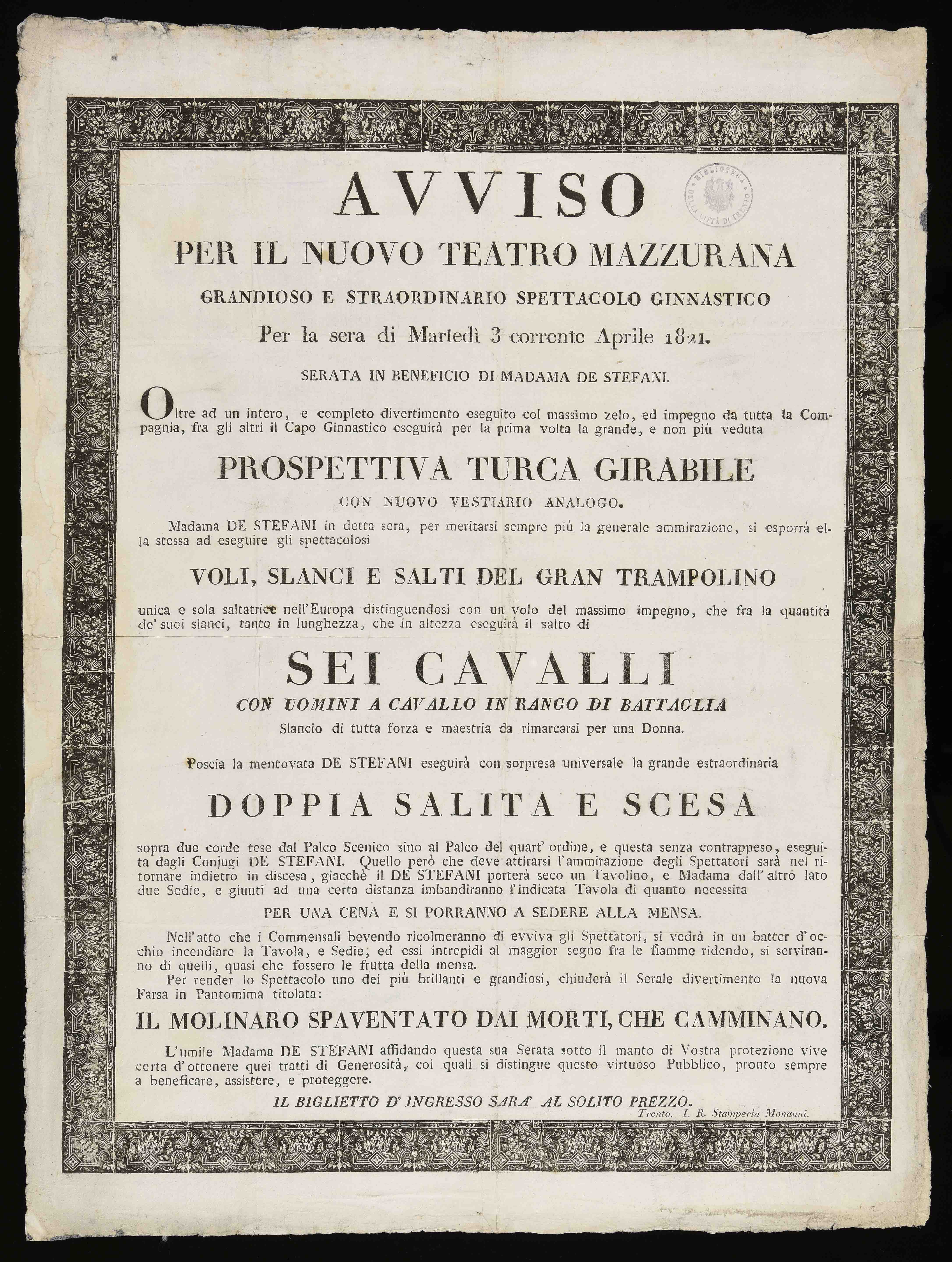 | Avviso per il nuovo teatro Mazzurana. Grandioso e straordinario spettacolo ginnastico per la sera di martedì 3 corrente aprile 1821. Serata in beneficio di madama De Stefani |