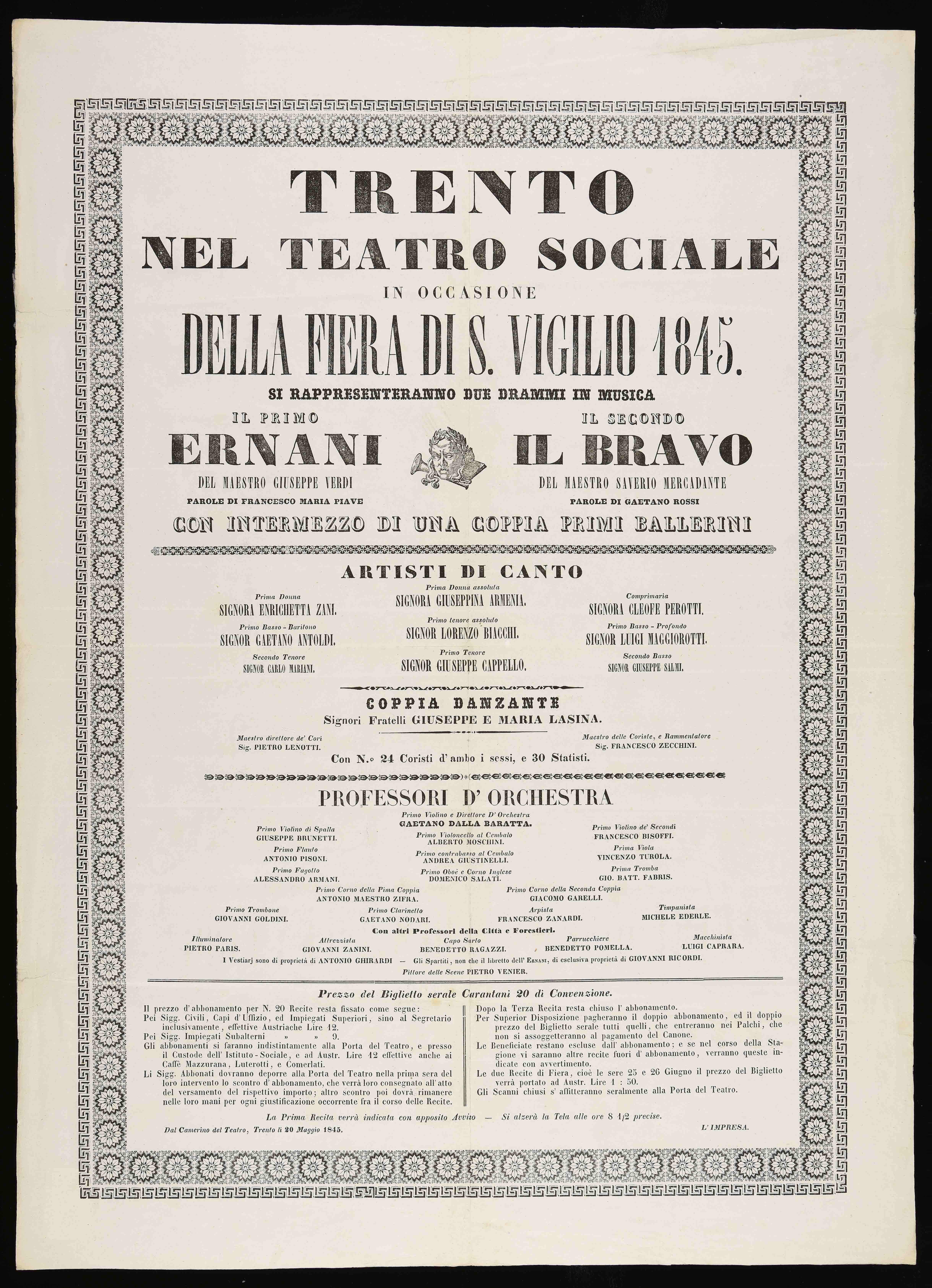 | Trento nel Teatro Sociale in occasione della fiera di S. Vigilio 1845 si rappresenteranno due drammi in musica |