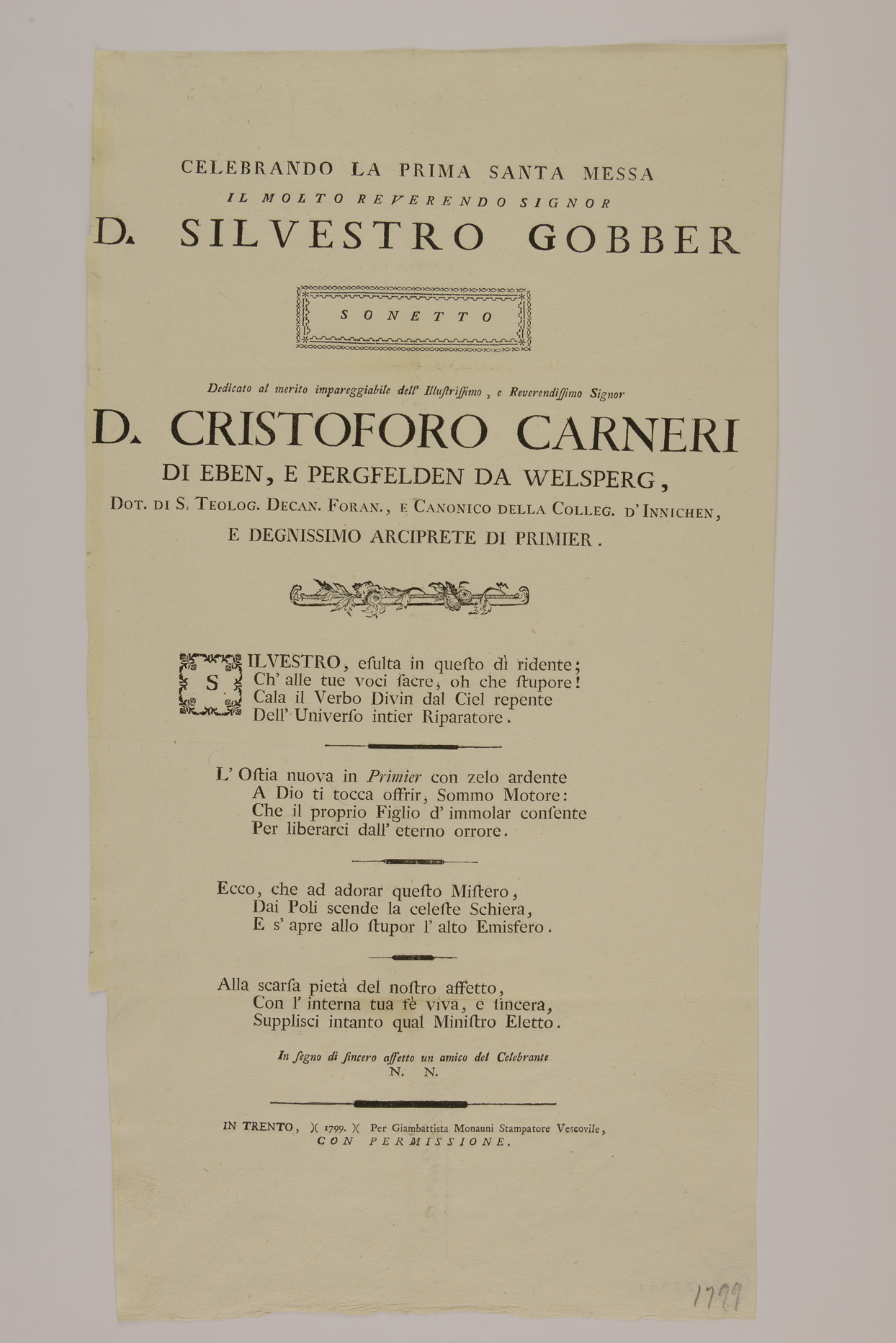 | Celebrando la prima sua santa messa il molto reverendo signor D. Silvestro Gobber. Sonetto ... |